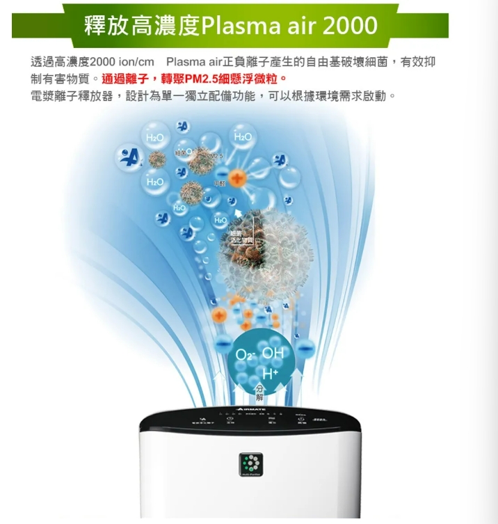 高濃度 Plasma air 電漿離子➜ 釋放 2000 ion/cm³,主動淨化空氣