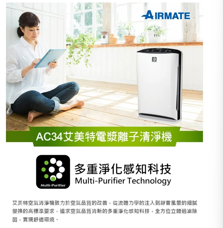 【Airmate艾美特】AC34 電漿離子清淨機|雖然價格是基本款,但空氣實力一點都不基本!「過年人一多,空氣比你想的更髒。」