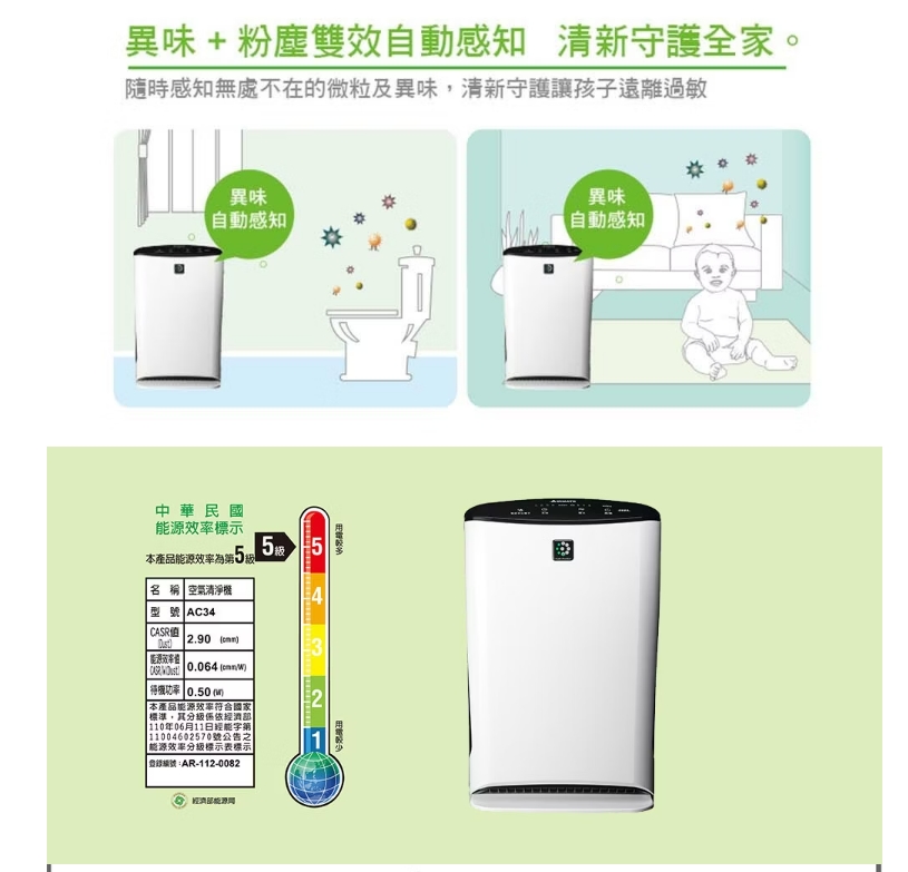 產品名稱:電漿離子清淨機產品型號:AC34適用坪數:~21m²產地:台灣設計中國製造顏色:清淨白濾網:濾網高效預先過濾 高吸附性活性碳濾網 多功能抗過敏濾網 奈米級HEPA濾網風量三段:自動模式/高檔/中檔/低檔感知器:異味感知燈定時關機:1h/2 h/ 4h/8 h/連續產品尺寸:527*336*206mm重量:5.3kg電源線長度:台灣BSMI 2.19M電源110V 60HZ額定功率 48W