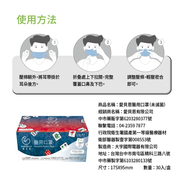 【BABYBELLE 愛貝恩】成人平面醫用口罩-麻將系列 30入 多款式選擇