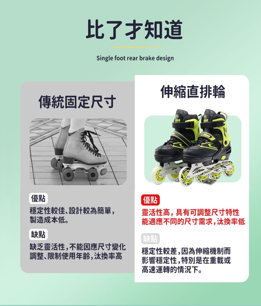 ◎警告使用者:不宜穿用不合尺碼之直排輪鞋,以防萬一之傷害。