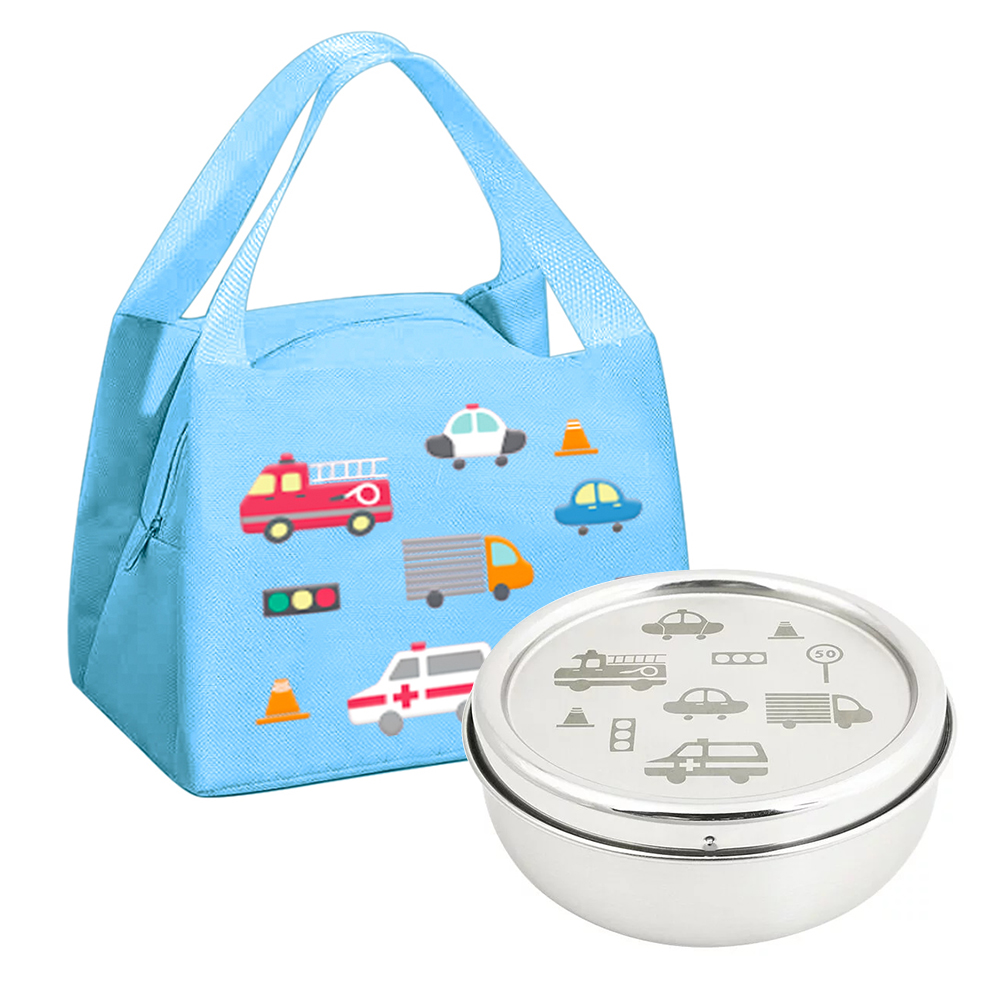 【KOM】台灣製316不鏽鋼兒童隔熱碗/附湯匙+防水牛津布保溫便當袋/餐袋 2入組(圖案任選)