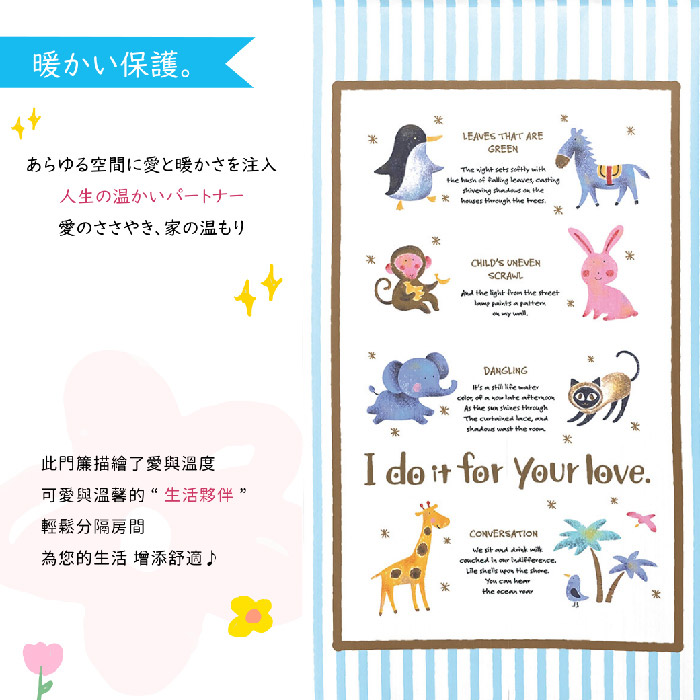 日本製【コスモ】長門簾《為你的愛而做》縦にストライプ状のレース編模様がある、編みレース生地を使用。レース生地の中でもしっかりとした生地ですので反対側がシルエット調に見えるくらいの透け感があります。おしゃれな洋風テイストは暖簾としてはもちろんタペストリーのようなご使用もおすすめです。洋風柄/洋柄/オシャレ/お洒落/インテリア/転写間仕切り/ポスター/動物/かわいい採用針織蕾絲布料製成,帶有垂直條紋蕾絲針織圖案。這款面料是目前最堅固的蕾絲布料之一。它是如此透明,以至於另一面看起來就像剪影一樣。推薦使用時尚的西方風格作為窗簾和掛毯。我們還建議將其用作掛毯。生產國:日本材質/成分:100%聚酯纖維包裝:獨立袋包裝尺寸:約85 公分(寬)x 150 公分(長)國際條碼:4943741947547出貨:門簾*1件清洗方式:可水洗、不可漂白、不可烘乾顏色:如圖,網頁產品因拍攝與各顯示器顯色不同關係,與實品略有差異, 此商品圖為參考用之情境圖示,產品內容以規格敘述內容為準適用:臥室門、廚房門、浴室門、衣櫥、玄關入口...等【注意事項】伸縮桿需自備,商品內容為門簾本體並無附桿子