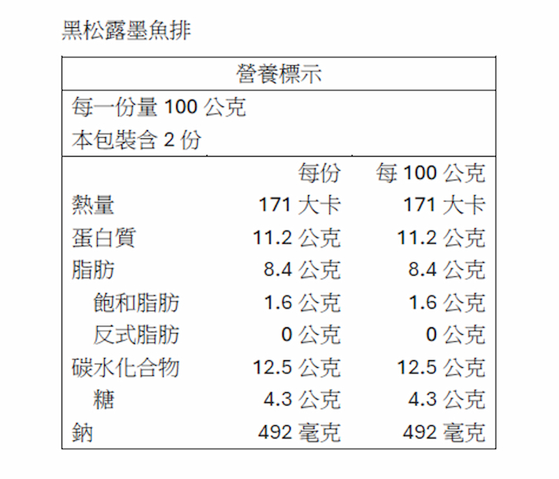 成分:花枝、魚漿、馬鈴薯澱粉、豬背脂(台灣)、義大利松露蘑菇醬(洋蘑菇、葵花油、特級初榨橄欖油、夏松露、黑橄欖、鹽、墨魚汁、香料)、糖、蛋白、鹽、麵包粉((小麥、L-抗壞血酸)、水、鹽、黃豆粉、精緻椰子油、酵母)、花枝墨囊、紅蔥酥(紅蔥頭、芥花油、麵粉)、胡椒粉、酵母萃取物、結著劑(焦磷酸鈉、偏磷酸鉀、多磷酸鈉)