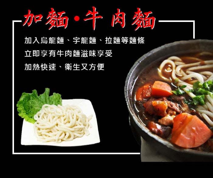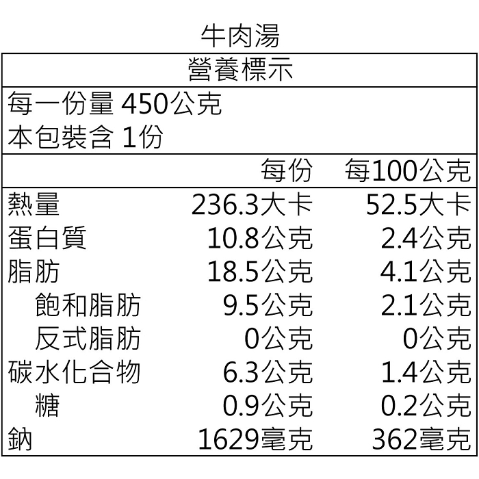 成份:水、牛肉〈紐西蘭〉、醬油、薑、辣豆瓣、牛肉精粉〈鹽、糖、牛肉〈紐西蘭〉、麥芽糊精、香辛料〈蔥、薑、桂皮〉、5'-次黃嘌呤核苷磷酸二鈉、5'-鳥嘌呤核苷磷酸二鈉、胺基乙酸、DL-胺基丙酸、二氧化矽、乙基麥芽醇〉、鹽、冰糖、花椒粒、辣椒粉、鮮味粉〈食鹽、乳糖、檸檬酸鈉、胺基乙酸、DL-胺基丙酸、、琥珀酸二鈉、5'-次黃嘌呤核苷磷酸二鈉、5'-鳥嘌呤核苷磷酸二鈉、酵母抽出物、麥芽糊精〉