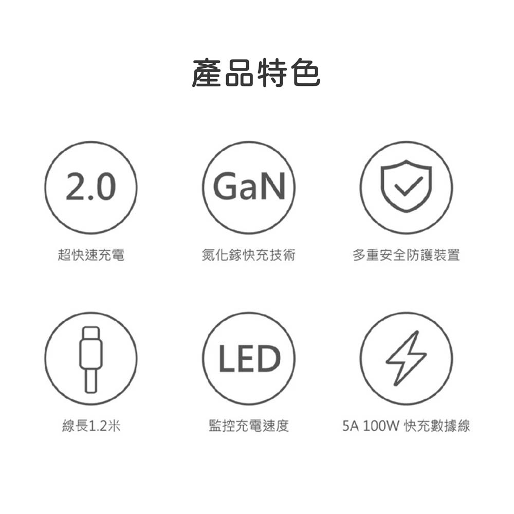 【產品資訊】1)2.0超快速充電2)GaN氮化鎵快充技術3)多重安全防護裝置4)充電線線長1.2米5)LED監控充電速度6)5A 100W 快充數據線