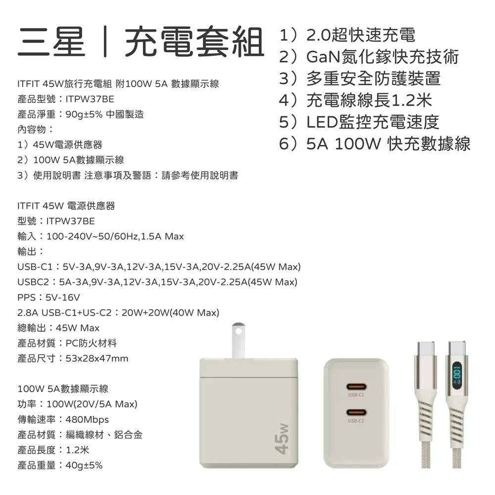 【山水之寶】三星充電套組 45W旅行充電組 45W雙PD孔旅行充電器+100W 5A 數據顯示線120cm 原廠公司貨
