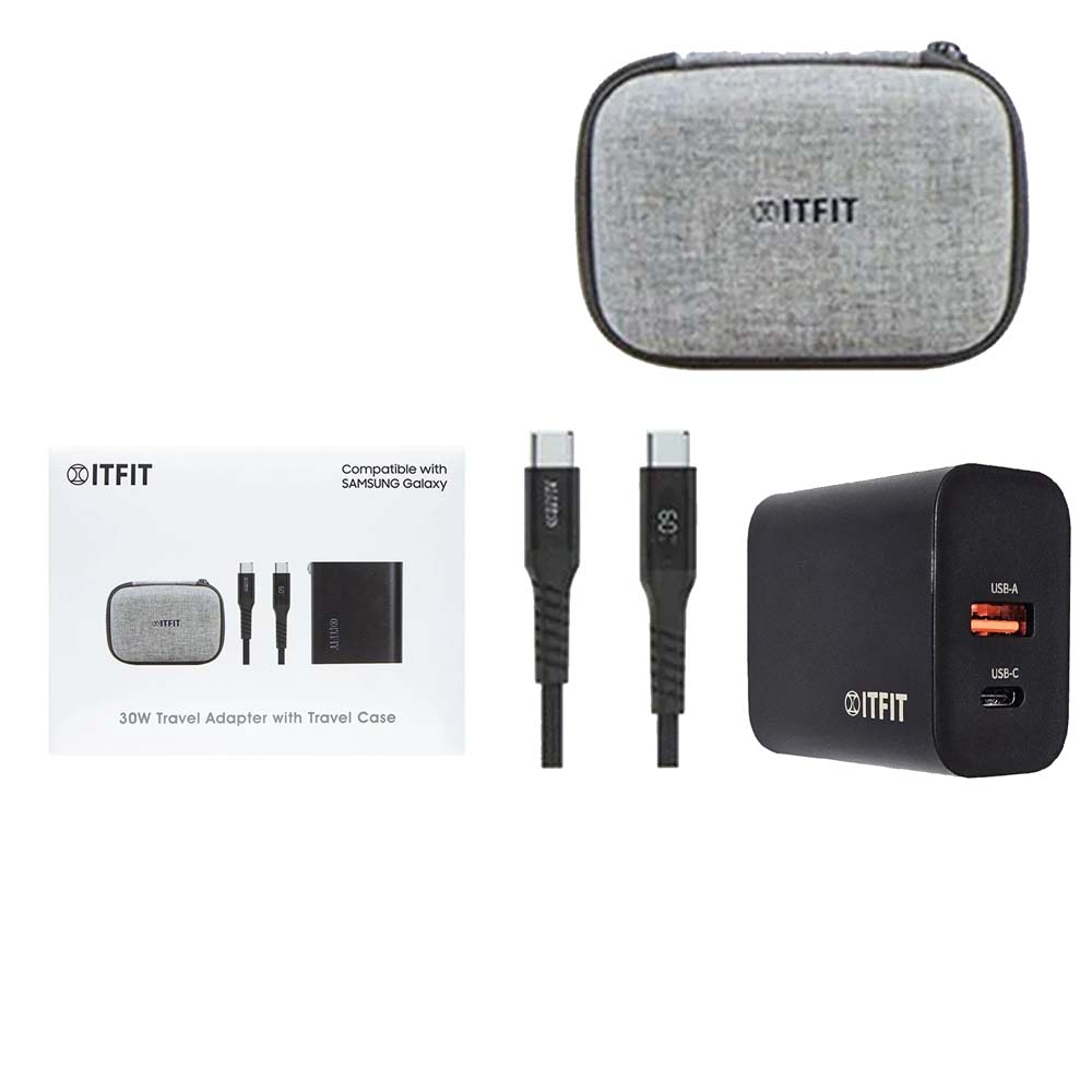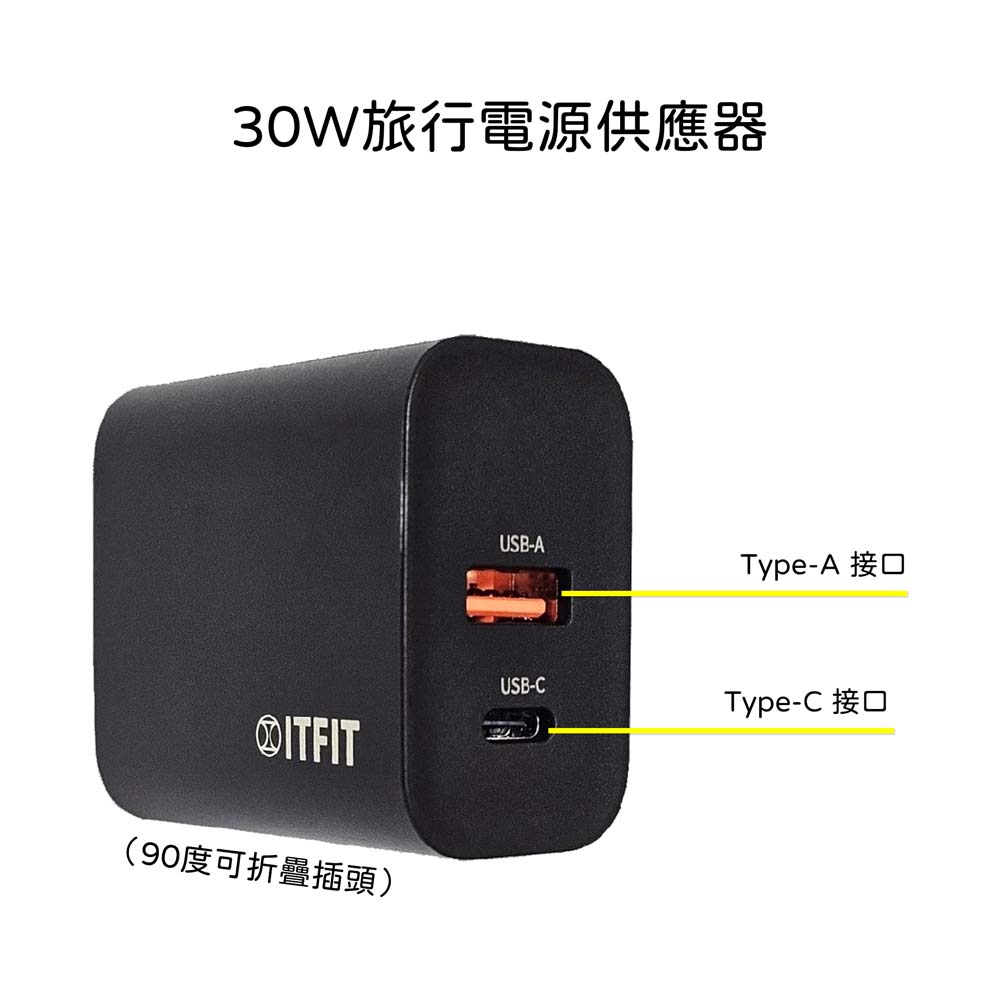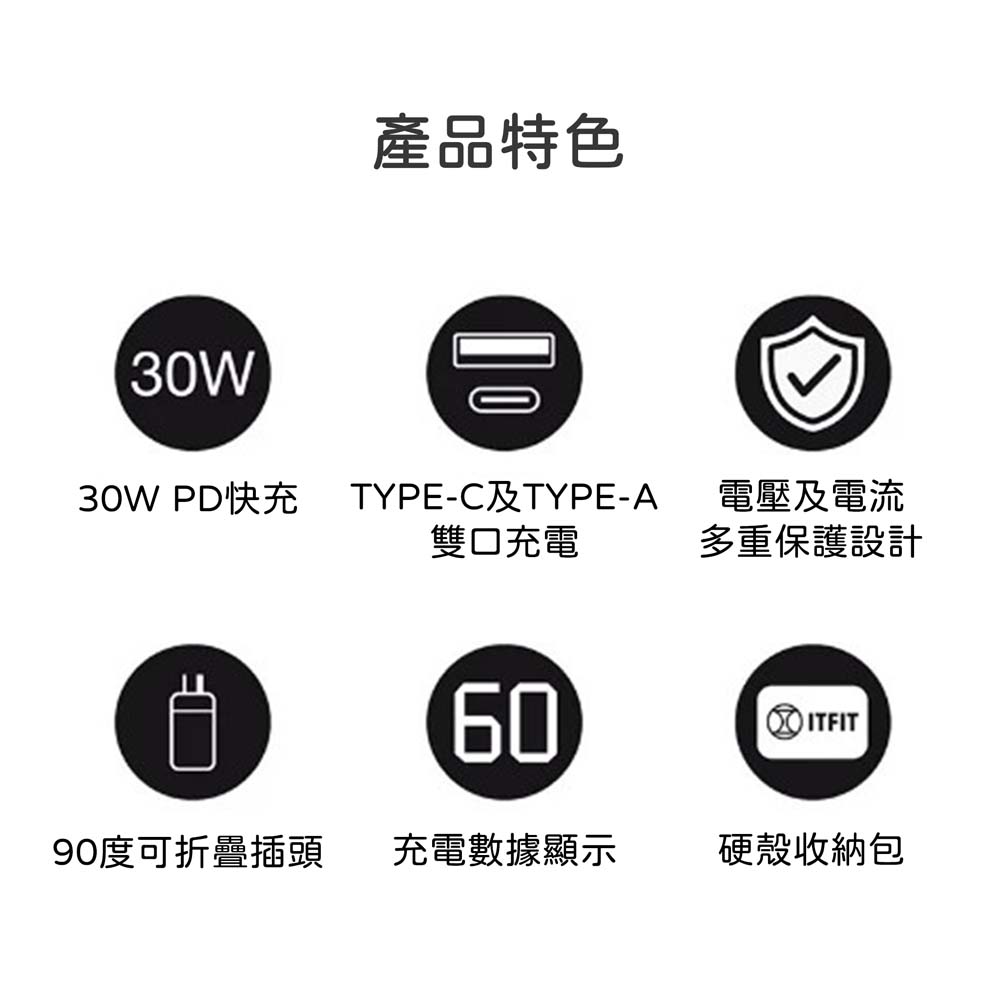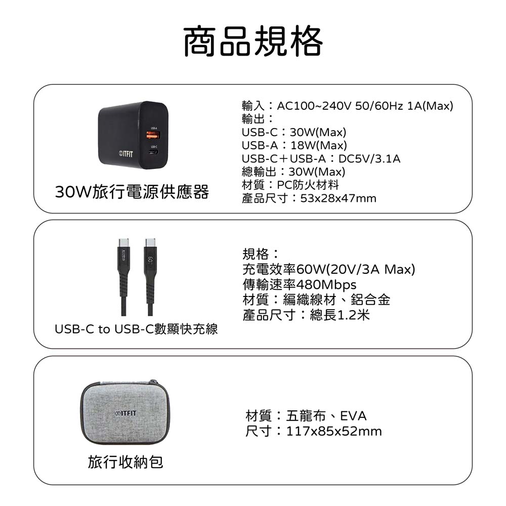 【內容物】1)30W旅行電源供應器2)USB-C to USB-C數顯快充線3)ITFIT旅行收納包4)使用說明書