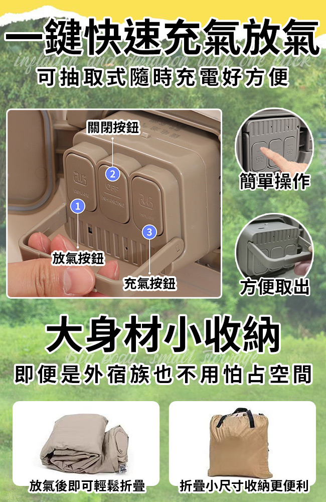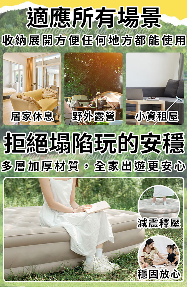 ◆好攜帶的好幫手,加高加厚自動充氣床◆露營、野餐、租屋、家用,內置氣泵,充氣不費力◆一鍵充氣免煩惱,貼合身體無壓迫感◆躺坐都舒適,貼合背部曲線,穩固支撐◆加大承重,支撐好睡眠,久睡不塌陷◆多層結構,親膚加密植絨材質◆可拆卸充氣泵,快速抽取、快速充氣◆一床多用,輕鬆解鎖多種生活方式