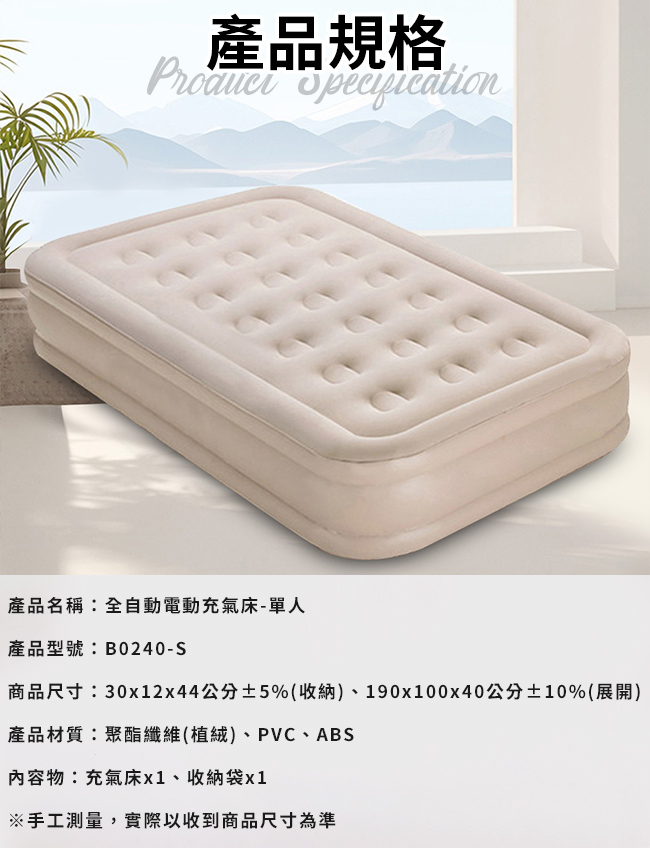 產品名稱:全自動電動充氣床-單人產品型號:B0240-S商品尺寸:30x12x44公分±5%(收納)、190x100x40公分±10%(展開)包裝尺寸:30x16x41公分±5%淨重/毛重:3.7公斤/4.1公斤±5%產品材質:聚酯纖維(植絨)、PVC、ABS內容物:充氣床x1、收納袋x1產地:中國※手工測量,實際以收到商品尺寸為準※因衛生問題,故拆開【使用導致有髒汙或是變形】,便不可退貨※新品瑕疵換新,不開放試用※本商品為接觸型商品,為避免接觸性傳染疾病,恕送回商品需為全新完整品