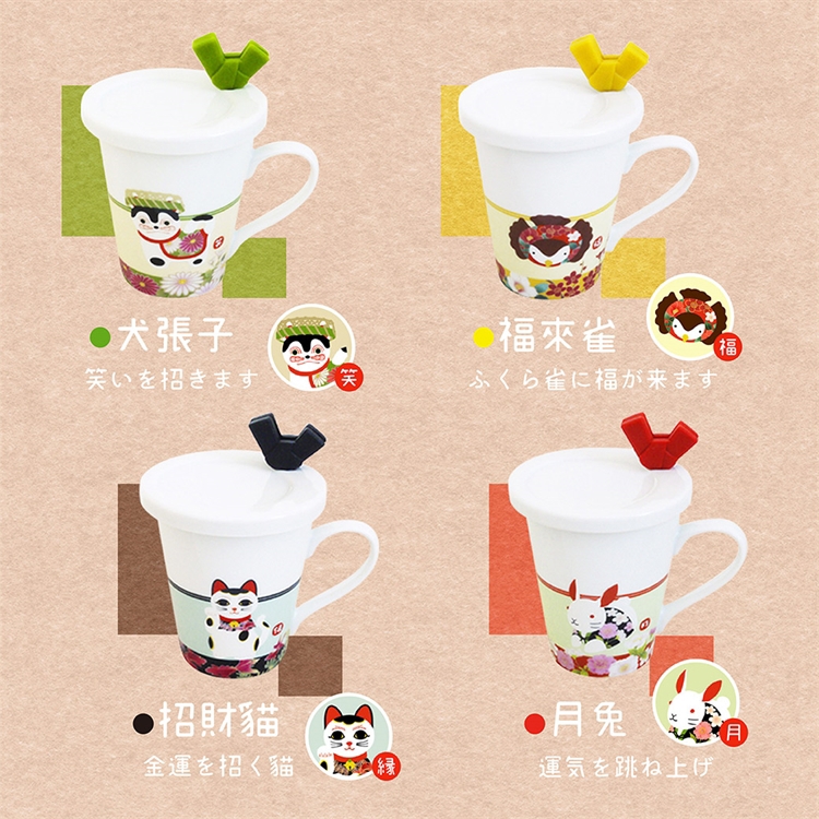 在日本日常生活中就可以看到很多吉祥物的裝飾用來招運、納福...等杯蓋可以用來當底座十分方便上端還有繩結樣式夾可以用來夾住小湯匙、小紙片貼心的設計~