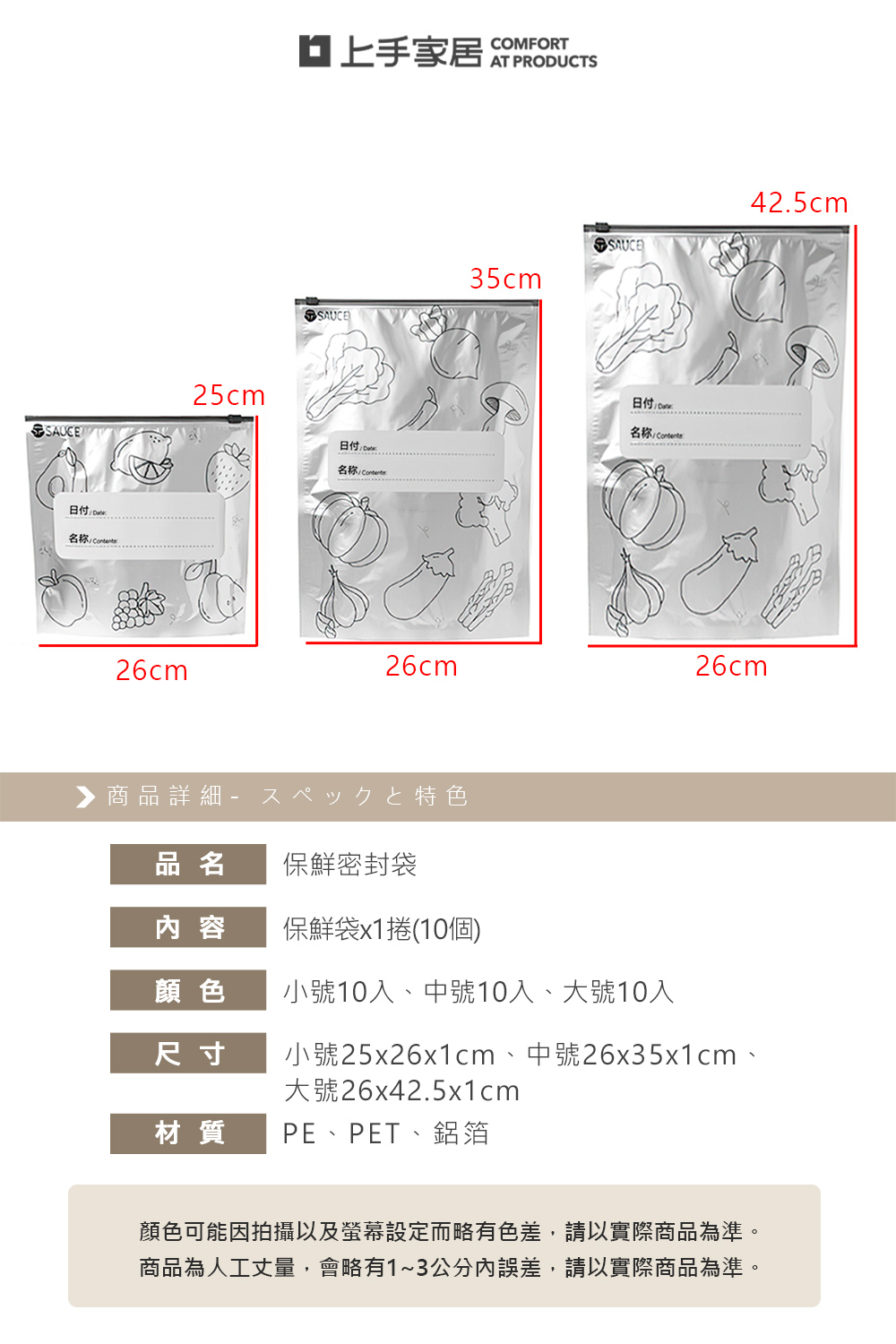 【上手家居】小號保鮮密封袋 10入(保鮮袋/食物袋/食物保鮮袋/鋁箔保鮮袋/食物夾鏈袋)