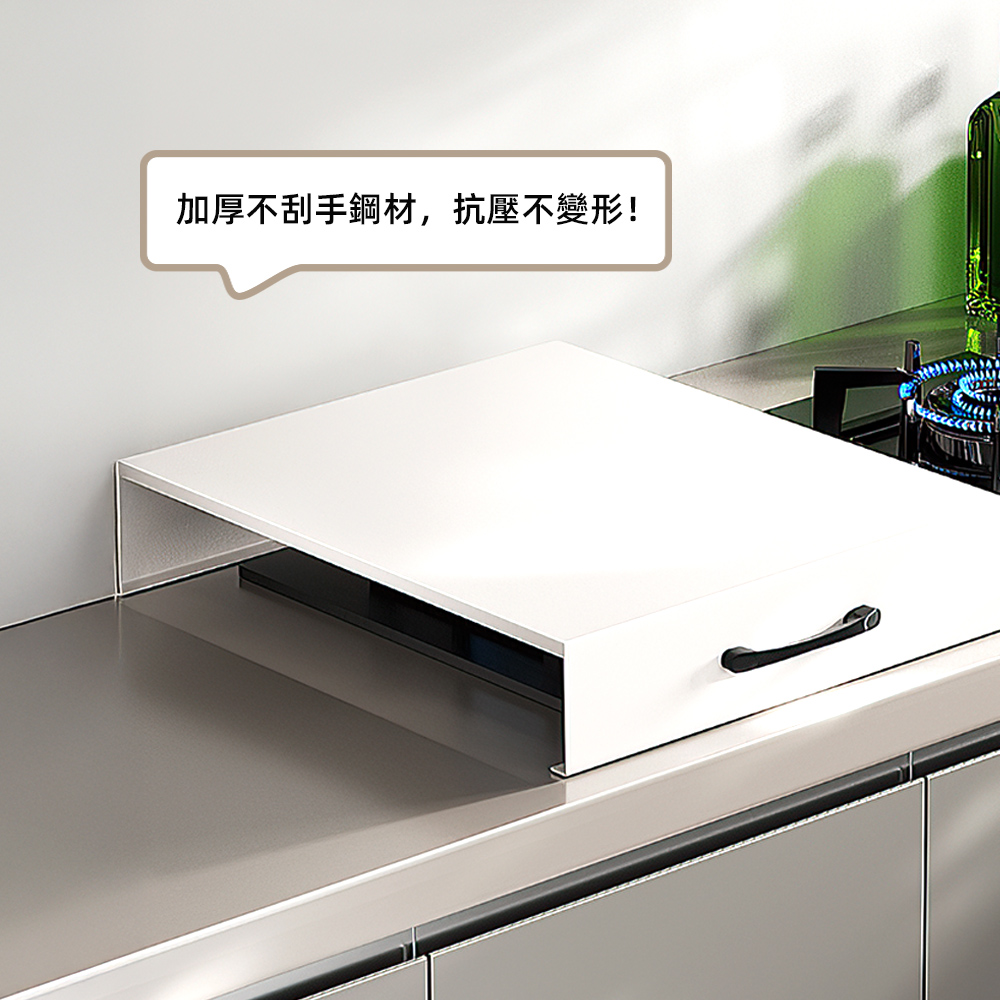 這款金屬瓦斯爐蓋板可直接覆蓋瓦斯爐,瞬間增加料理與備料空間,切菜、擺放鍋具都更順手。適用 35cm 寬、45cm 長的台灣常見檯面尺寸,讓原本的爐台轉換為實用檯面,廚房動線更流暢。