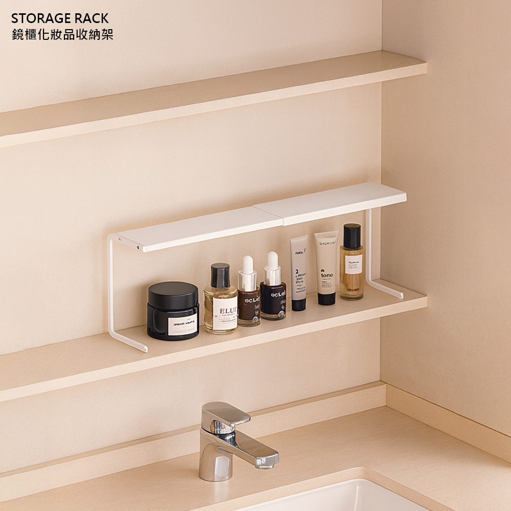 這款鏡櫃化妝品收納架可自由伸縮 35~60cm,靈活適配不同櫃體,將瓶罐、乳液、香氛整齊分層收納。僅 9cm 寬的小巧設計,不佔空間卻大幅提升利用率,浴室、廚房、窗台皆可使用,日系極簡質感讓空間更清爽俐落。
