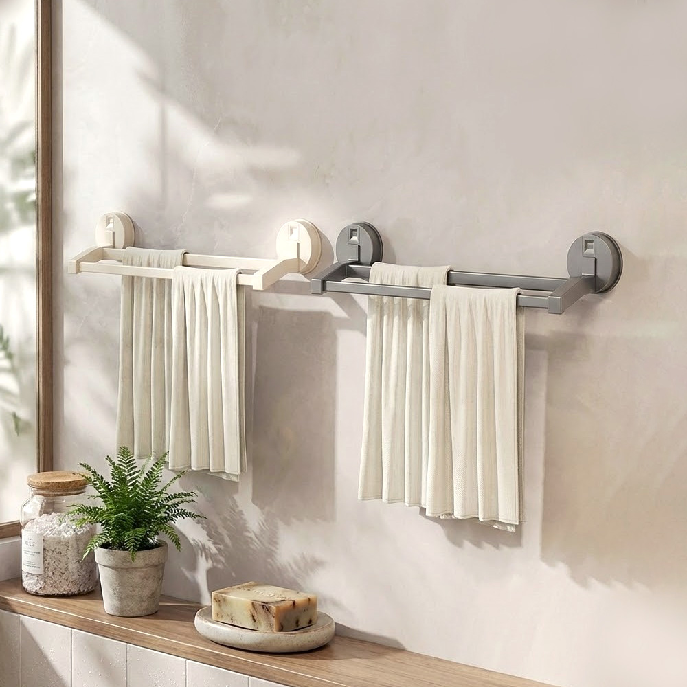 這款吸盤雙桿毛巾架採用第三代高分子吸盤,安裝時無需鑽牆,直接吸附即可使用。60 公分雙桿分層設計,讓兩條毛巾自然分開晾掛,增加通風空間,日常使用更清爽。