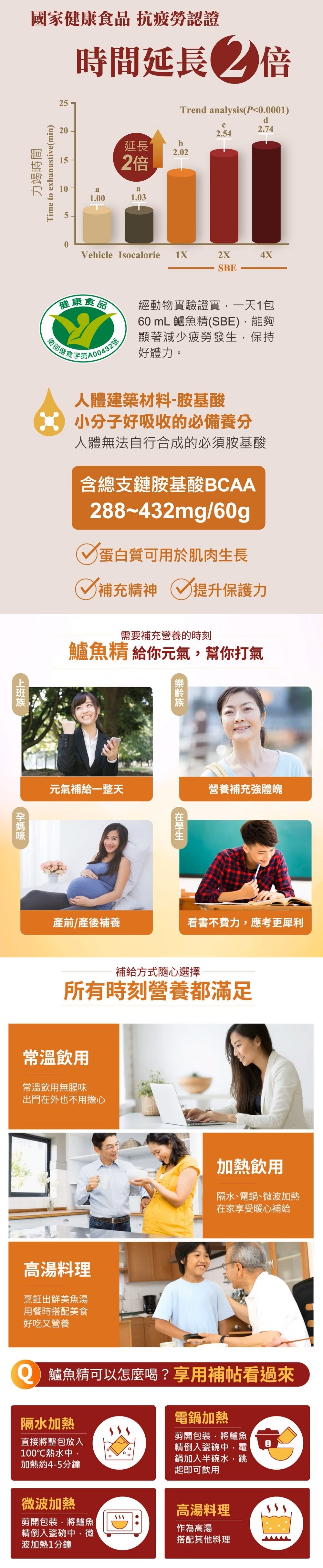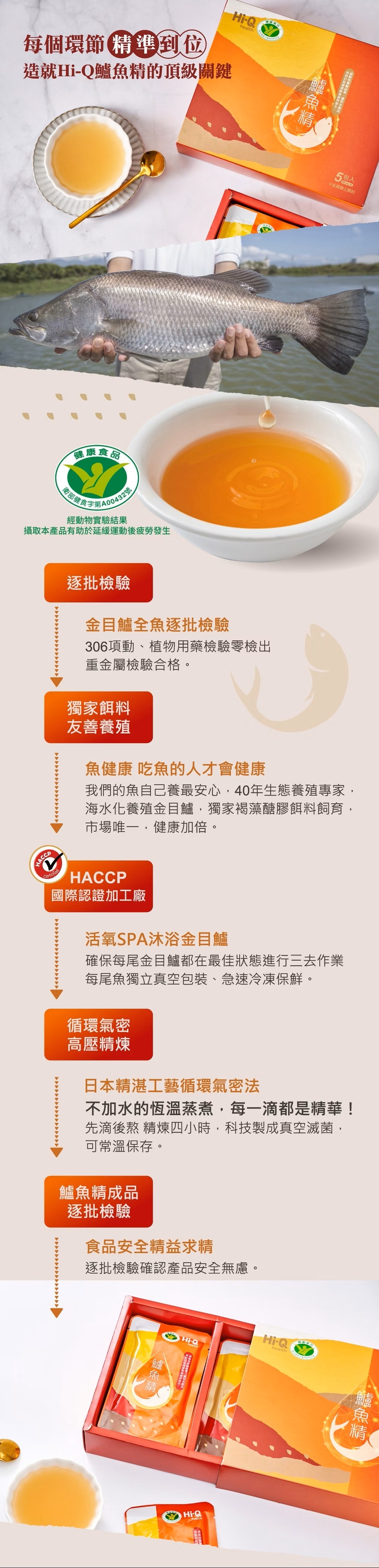 品名:Hi-Q鱸魚精健康食品認證經動物實驗結果,攝取本產品有助於延緩運動後疲勞發生。成分:鱸魚、薑每日建議攝取量:60 毫升內容量:60 毫升/包,5 包/盒保存方式:請放置陰涼乾燥處,避免陽光直射保存期限:常溫(25°C)18個月(未開封)原產地:台灣出品公司:中華海洋生技股份有限公司公司地址:臺北市松山區八德路4段123之1號諮詢電話:0800-043-388注意事項:● 本產品供保健用,請依建議攝取量食用。● 請勿將整包鋁箔袋放入微波爐加熱。● 本產品顏色、口感可能會因每批魚材而略有差異。● 本產品出廠前經品質檢驗合格,若有發生包裝不良或產品膨脹等現象,請勿食用,請立即撥打服務專線為您處理。警 語:● 本產品含有魚類製品,不適合對其過敏體質者飲用。● 支鏈有機酸尿症(楓糖尿症)患者應避免食用。● 痛風、高血壓及腎臟病患者飲用前請先諮詢醫生後始飲用。