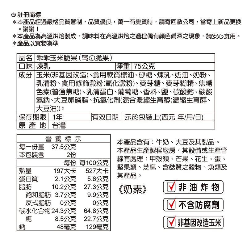 ◎品牌:乖乖 ◎規格: 75g克 x 1 x 1Bag包
