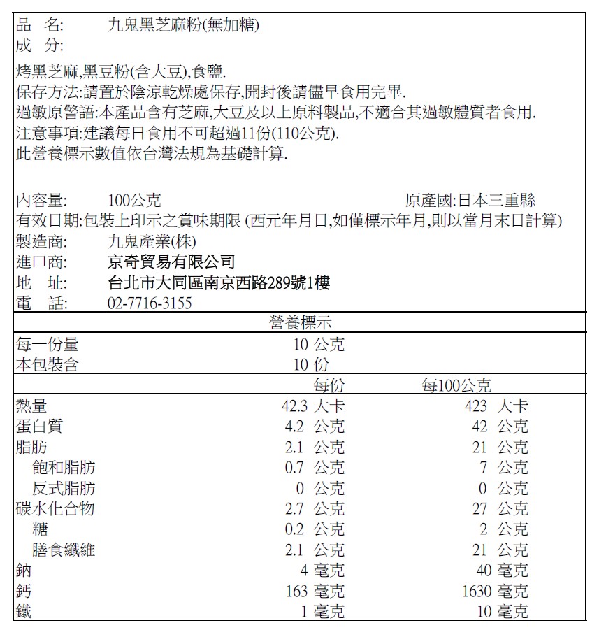 九鬼黑芝麻粉(無加糖)
