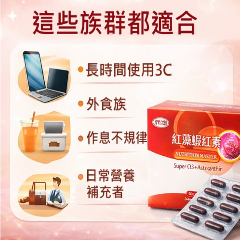亞麻仁油、紫蘇油、紅藻萃取物(含蝦紅素)16毫克、金盞花萃取物(含葉黃素)、脂肪酸甘油酯
