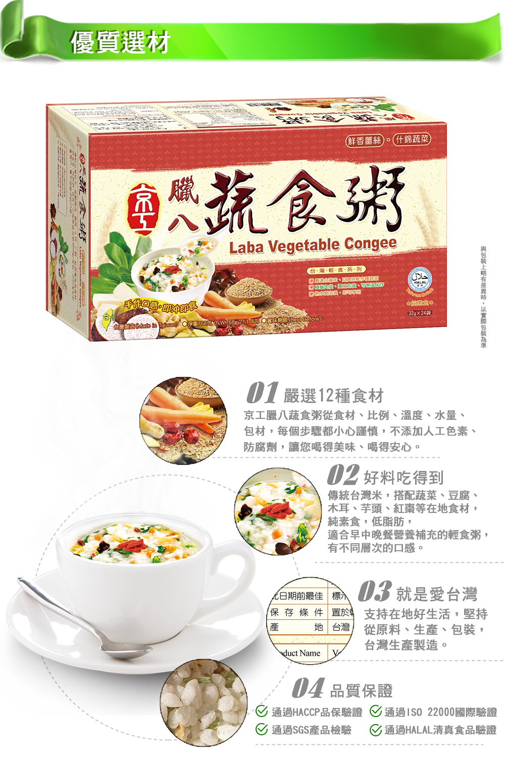 品名 臘八蔬食粥(純素食) 成份 白米、糙米、青江菜、豆腐皮、黑木耳、紅蘿蔔、芋頭、豆腐、枸杞、紅棗、昆布粉、薑、食用鹽。 過敏原資訊 本產品含大豆及其製品,該生產線亦生產含麩質之穀物、芝麻、牛奶、堅果、花生。 內容量 32gx24包 此日期前最佳 標示於盒蓋上(年/月/日) 保存條件 置於乾燥通風處 產地 台灣 注意事項 無添加防腐劑,飲品沖泡後請儘速飲用完畢 製造商 京工興業有限公司 地址 新北市中和區新民街94巷12號 本產品已投保產品責任險新台幣3,000萬元 營養標示數據若與包裝上略有差異時,以實際包裝上標示為準