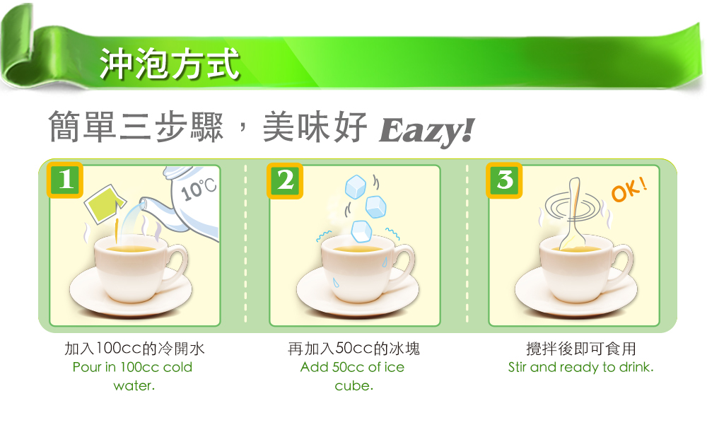 綠色蔬果 甘甜爽口 一包可沖泡一杯咖啡杯約150-200cc。加入150-200cc冷水攪拌即可飲用。(★限冷飲沖泡)
