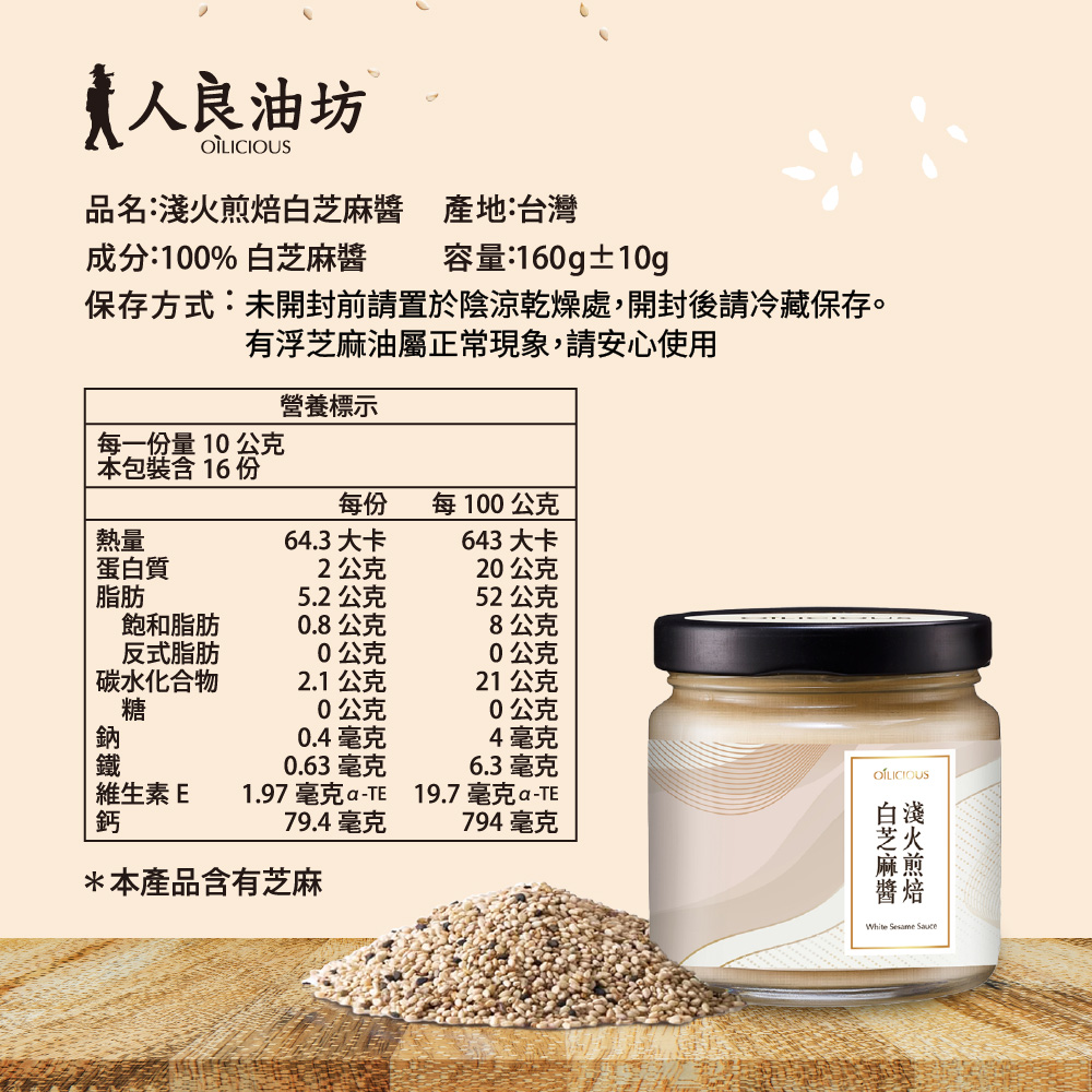 [人良油坊]溫火烘焙白芝麻醬160g