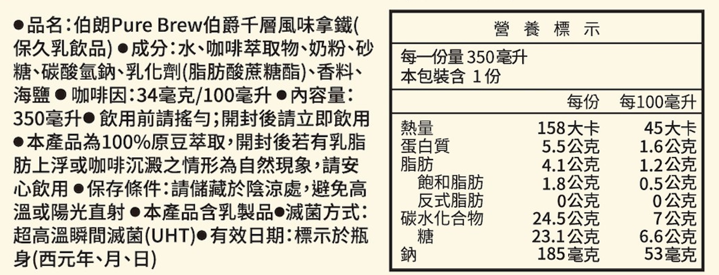 伯朗Pure Brew 伯爵千層風味拿鐵 350ml