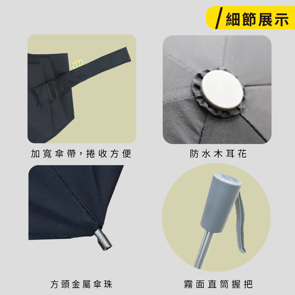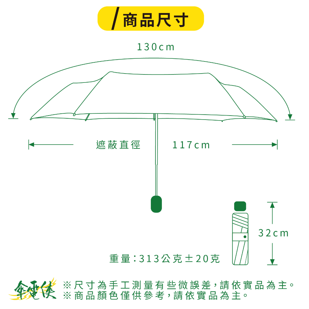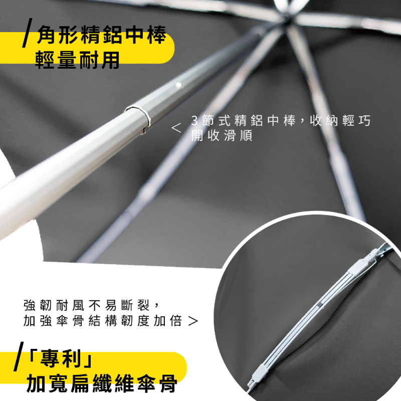 ☂️【商品特色】⚡️本賣場皆為現貨,無需長期等待⚡️ 高效五級撥水桃皮消光布隔絕紫外線效果達99.5%傘下隔熱降溫達8°C傘布經過全國公證檢驗和紡織研究所品質有保證⚡️專利扁纖維傘骨經過中央大學風洞實驗室12級颶風摧殘傘骨完好如初⚡️安全推拉式開關直覺式開收傘設計⚡️防水木耳花 + 質感霧面握把, 小細節質感再升級⚡️三節式陽極處理全鋁角中棒,耐鏽好推收☂️【詳細規格】⚡傘骨:65X6K鐵鋁+FRP玻纖骨⚡傘布:99.5%抗紫外線 50DX50D 300T桃皮消光布⚡重量:313公克±10克⚡收合長度:32cm⚡展開直徑:117cm☂️【運送資訊】服務營業時間為週一至週五 9:00~12:00 13:00~17:00每週六及週日暫停出貨☂️【終身維修】傘電俠的商品均享有終身維修的服務,但因需更換的零件不同,我們會請專業維修人員一雨傘的實際狀況評估是否需要酌收更換零件的材料費用,我們會與您報價後,您再決定是否要維修。☂️【注意事項(退換貨/FAQ)】🔸傘電俠的商品都是原廠,提供優質雨具,有任何問題歡迎聊聊~🙋🏻♀️(收到商品後有疑問可以先聊聊,讓小編協助一起了解商品狀況,不要隨意退貨喲!><)<br>🔹下單後會盡量在3日內出貨,請大家也要記得取貨呦📦🔸收到商品有任何問題或需要維修服務可聯絡我們,若喜歡我們的商品,也歡迎留下您的好評👏🏻🔹六日與國定假日不營業,其餘上班時間會盡快處理訂單跟回覆訊息✉️🔸為保障彼此權益,拆封時請全程錄影,若商品有問題須於三日內提供全程錄影檔,逾期恕無法受理!🔹收到商品後所有任何瑕疵狀況,請於收到貨品後3日內提出(請保持商品在全新的狀態且包裝/吊牌完整,否則無法受理),如需退貨「請勿按完成訂單」,「按退貨選項即可完成退貨」🔸請正確使用雨傘以延長傘的使用壽命,淋雨後請務必撐開放置陰涼處陰乾。維修服務、正確使用/保養方式,請詳讀說明書。🔹尺寸皆為手工測量,會有些許差距。商品顏色會因每個螢幕顯示不同而有些許色差,若會介意下單前請三思。