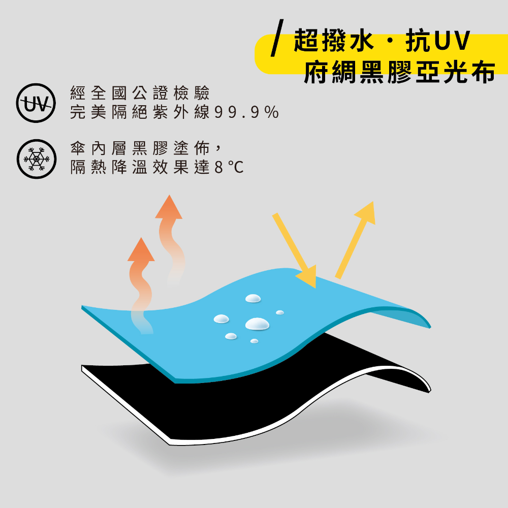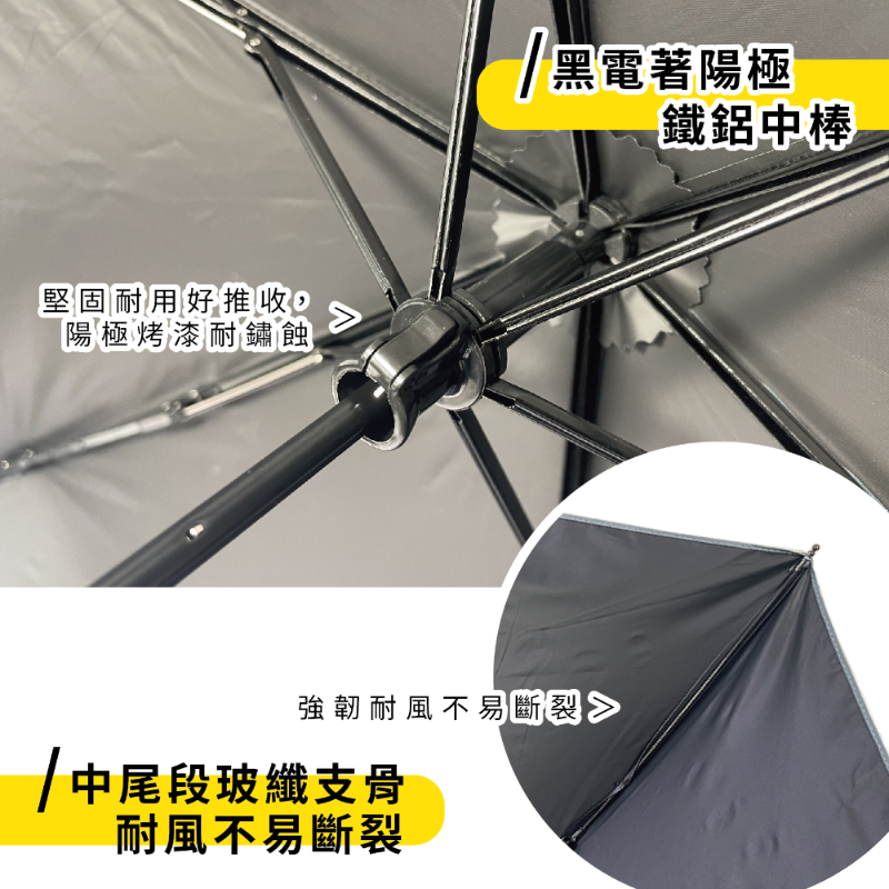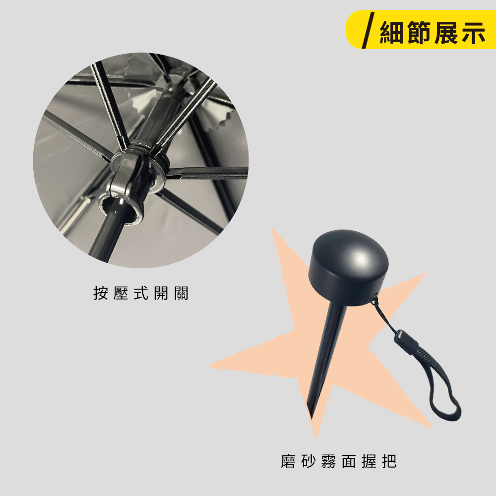 ☂️【商品特色】⚡本賣場皆為現貨,無需長期等待⚡撥水度四級黑膠亞光布隔絕紫外線效果達99.5%傘下隔熱降溫達8°C傘布經過全國公證檢驗和紡織研究所品質有保證⚡安全開關防夾手設計⚡三段式鐵鋁中棒,耐鏽好推收⚡中尾段FRP玻纖支骨,強韌耐風不易斷裂☂️【詳細規格】⚡傘骨:55X6K鐵鋁+FRP玻纖骨⚡傘布:99.9%抗紫外線 府綢黑膠布 降溫8度⚡重量:208±10克⚡收合長度:23cm⚡展開直徑:98cm☂️【運送資訊】服務營業時間為週一至週五 9:00~12:00 13:00~17:00每週六及週日暫停出貨☂️【終身維修】傘電俠的商品均享有終身維修的服務,但因需更換的零件不同,我們會請專業維修人員一雨傘的實際狀況評估是否需要酌收更換零件的材料費用,我們會與您報價後,您再決定是否要維修。☂️【注意事項(退換貨/FAQ)】🔸傘電俠的商品都是原廠,提供優質雨具,有任何問題歡迎聊聊~🙋🏻♀️(收到商品後有疑問可以先聊聊,讓小編協助一起了解商品狀況,不要隨意退貨喲!><)<br>🔹下單後會盡量在3日內出貨,請大家也要記得取貨呦📦🔸收到商品有任何問題或需要維修服務可聯絡我們,若喜歡我們的商品,也歡迎留下您的好評👏🏻🔹六日與國定假日不營業,其餘上班時間會盡快處理訂單跟回覆訊息✉️🔸為保障彼此權益,拆封時請全程錄影,若商品有問題須於三日內提供全程錄影檔,逾期恕無法受理!🔹收到商品後所有任何瑕疵狀況,請於收到貨品後3日內提出(請保持商品在全新的狀態且包裝/吊牌完整,否則無法受理),如需退貨「請勿按完成訂單」,「按退貨選項即可完成退貨」🔸請正確使用雨傘以延長傘的使用壽命,淋雨後請務必撐開放置陰涼處陰乾。維修服務、正確使用/保養方式,請詳讀說明書。🔹尺寸皆為手工測量,會有些許差距。商品顏色會因每個螢幕顯示不同而有些許色差,若會介意下單前請三思。