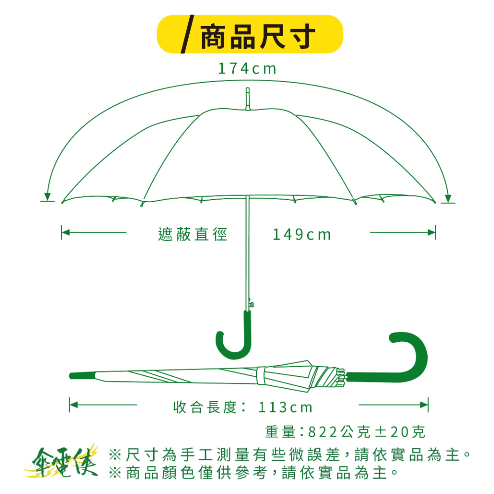☂️【商品特色】⚡️本賣場皆為現貨,無需長期等待⚡️ 防潑水PONGEE布隔絕紫外線效果達95.5%傘下隔熱降溫8度傘布經過全國公證檢驗和紡織研究所品質有保證⚡️傘面超大遮蔽直徑149公分⚡️鋁中棒+玻纖骨架,耐風有彈性不易斷⚡️反光包邊,夜間行走安全⚡️家庭出遊、接送適用☂️【詳細規格】⚡傘骨:85X8AJ 全FRP玻纖骨⚡傘布:95.5%抗紫外線 PONGEE 防潑水布⚡重量:822±20克⚡收合長度:113cm⚡展開直徑:149cm☂️【運送資訊】服務營業時間為週一至週五 9:00~12:00 13:00~17:00每週六及週日暫停出貨☂️【終身維修】傘電俠的商品均享有終身維修的服務,但因需更換的零件不同,我們會請專業維修人員一雨傘的實際狀況評估是否需要酌收更換零件的材料費用,我們會與您報價後,您再決定是否要維修。☂️【注意事項(退換貨/FAQ)】1.使用前請先閱讀說明書上使用方法2.若您收到的商品有瑕疵、破損、零件短缺的狀況,請您於收到貨品後15天內提出~(請保持商品在全新的狀態且包裝完整)我們都是可以免費退貨的,如需退貨“請不要按”完成訂單和評價!按退貨選項就可以退貨了喔,我們會馬上幫您處理3.雨天使用後,請務必將傘撐開放置於陰涼處陰乾,延長傘的使用壽命4.溫馨提醒尺寸皆為手工測量,會有些許範圍差距顏色因每個螢幕顯示不同會有些許色差,若您會介意的話,建議下單前請三思