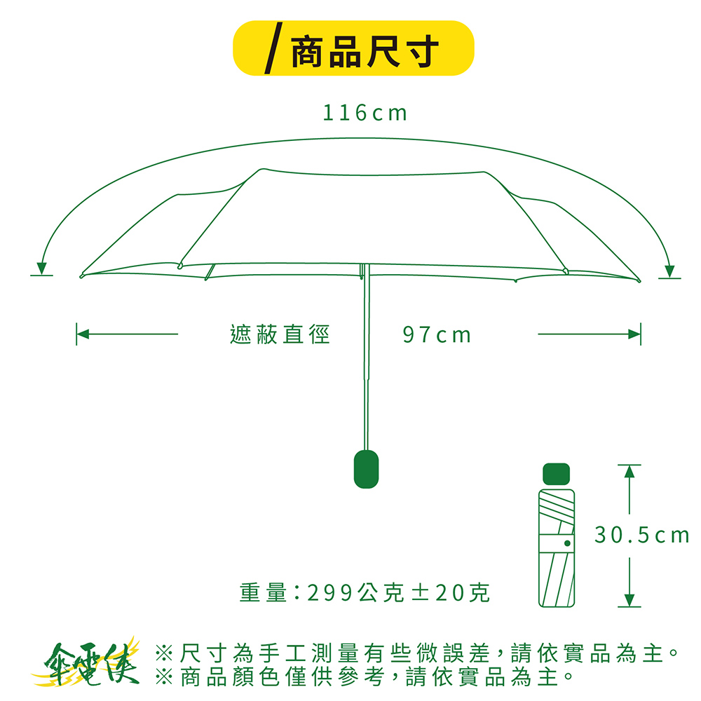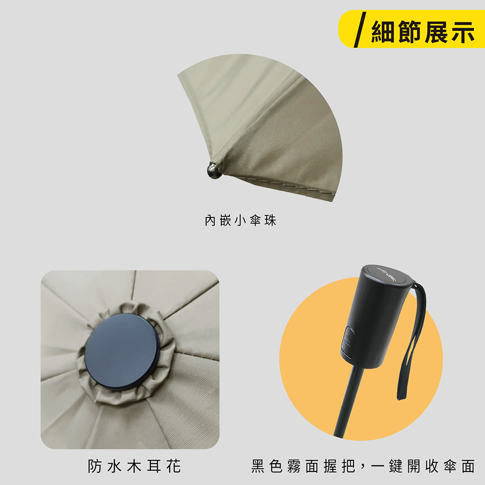 ☂️【商品特色】⚡️本賣場皆為現貨,無需長期等待⚡️ 高效五級撥水型態安定布紫外線防護等級UPF50+傘下隔熱降溫達8°C傘布經過全國公證檢驗和紡織研究所品質有保證⚡️型態安定布,記憶壓痕,收傘更輕鬆,手不夠巧也能收得漂漂亮亮!⚡️安全節節收的自動開收傘設計, 隨收隨停, 收傘不用練武功!⚡️霧面握把、配色木耳花,質感再升級!⚡️三節防暴衝式安全黑電著二鋁一鐵中棒,耐鏽好推收!☂️【詳細規格】⚡傘骨:58X7K鐵鋁+FRP玻纖骨⚡傘布:99.9%抗紫外線 降溫8度 型態安定布⚡重量:299公克±10克⚡收合長度:30.5cm⚡展開直徑:97cm☂️【運送資訊】下午3點前下標都會是當日出貨喔若超過下午3點就會隔日出貨服務營業時間為週一至週五 9:00~12:00 13:30~18:00每週六及週日暫停出貨☂️【終身維修】傘電俠的商品均享有終身維修的服務,但因需更換的零件不同,我們會請專業維修人員一雨傘的實際狀況評估是否需要酌收更換零件的材料費用,我們會與您報價後,您再決定是否要維修。☂️【注意事項(退換貨/FAQ)】1.使用前請先閱讀說明書上使用方法2.若您收到的商品有瑕疵、破損、零件短缺的狀況,請您於收到貨品後15天內提出~(請保持商品在全新的狀態且包裝完整)我們都是可以免費退貨的,如需退貨“請不要按"完成訂單和評價!按退貨選項就可以退貨了喔, 我們會馬上幫您處理3. 雨天使用後, 請務必將傘撐開放置於陰涼處陰乾, 延長傘的使用壽命4. 溫馨提醒尺寸皆為手工測量, 會有些許範圍差距顏色因每個螢幕顯示不同會有些許色差, 若您會介意的話, 建議下單前請三思#傘電俠 #安全自動開收傘 #降溫傘 #輕量傘 #抗UV傘 #快乾傘