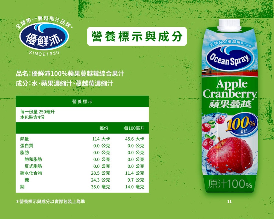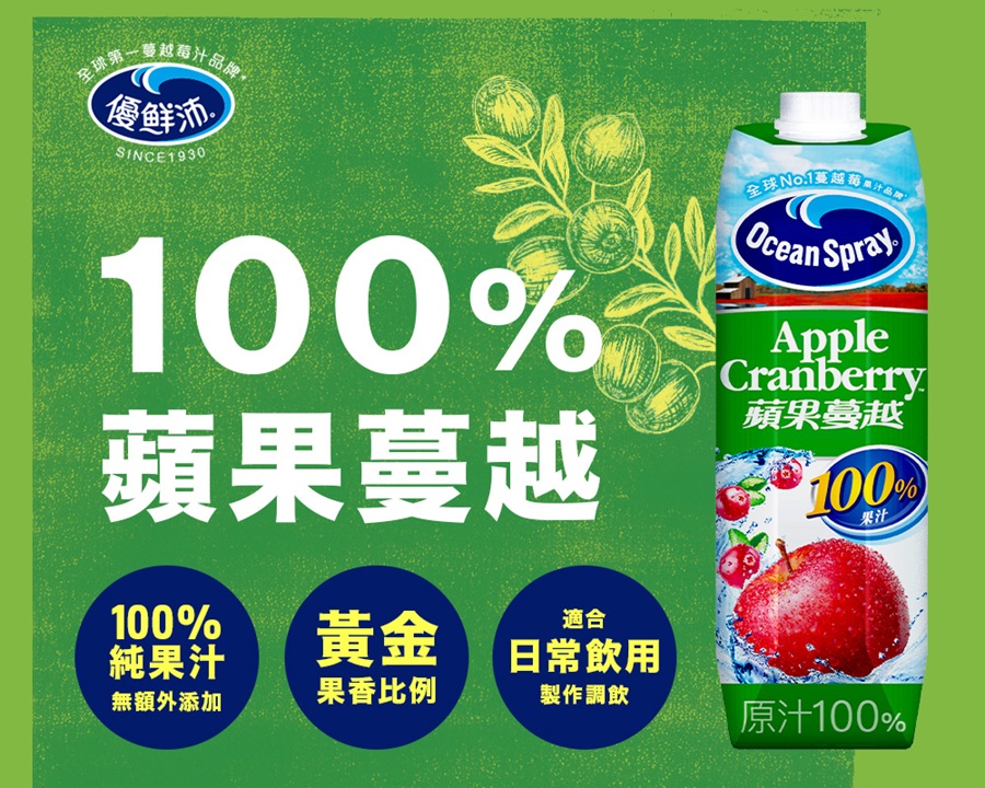 優鮮沛100%蘋果蔓越莓綜合果汁1000ml