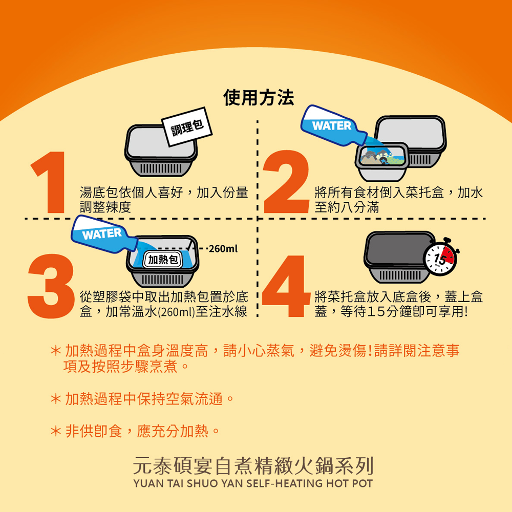 麻辣番茄湯底:麻辣醬(食用大豆油、食鹽、辣椒、豆瓣醬(辣椒、蠶豆、食鹽、麵粉)、花椒、薑、白酒、蒜頭、蔗糖、大蔥、胡椒、5'-鳥嘌呤核苷磷酸二鈉、5'-次黃嘌呤核苷磷酸二鈉、酵母萃取物(酵母萃取物、鹽)、豆蔻、肉豆蔻、小茴香、桂皮、八角、丁香、陳皮、甘草)、番茄醬(蕃茄、番茄泥、橄欖油、食鹽、大蒜、胡蘿蔔泥、脫水洋蔥、糖、羅勒、香辛料(大蒜粉)) 海鮮調理包:猴頭菇、小卷、干貝、魚肚、明蝦乾、小魚乾、鹽、味素、冰糖 雞肉調理包:雞肉、素竹輪、沙拉油、麻辣醬(食用大豆油、食鹽、辣椒、豆瓣醬(辣椒、蠶豆、食鹽、麵粉)、花椒、薑、白酒、蒜頭、蔗糖、大蔥、胡椒、5'-鳥嘌呤核苷磷酸二鈉、5'-次黃嘌呤核苷磷酸二鈉、酵母萃取物(酵母萃取物、鹽)、豆蔻、肉豆蔻、小茴香、桂皮、八角、丁香、陳皮、甘草) 綜合蔬菜包:馬鈴薯、黑木耳、胡蘿蔔、香菇、水、食鹽、L-麩酸鈉、乳酸、檸檬酸、5’-鳥嘌呤核苷磷酸二鈉、5’-次黃嘌呤核苷磷酸二鈉 冬粉:馬鈴薯澱粉、綠豆澱粉