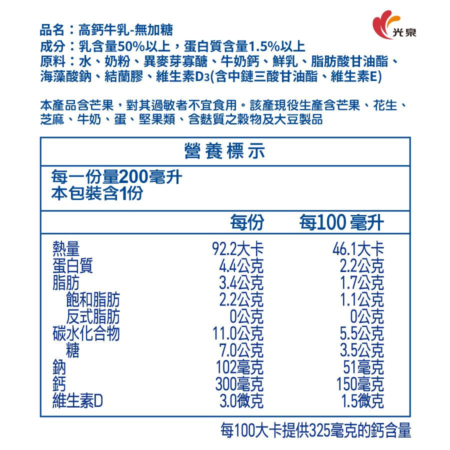 光泉高鈣牛乳-無加糖200ml