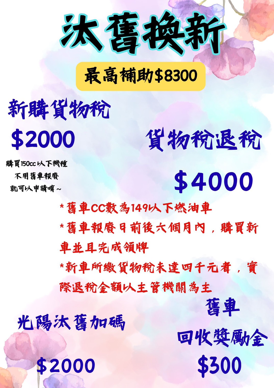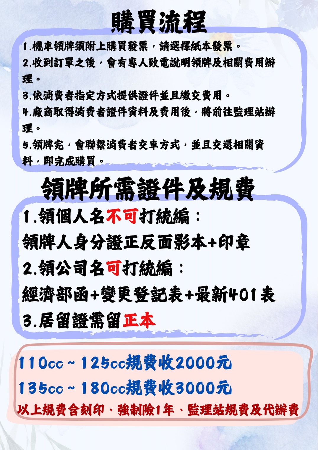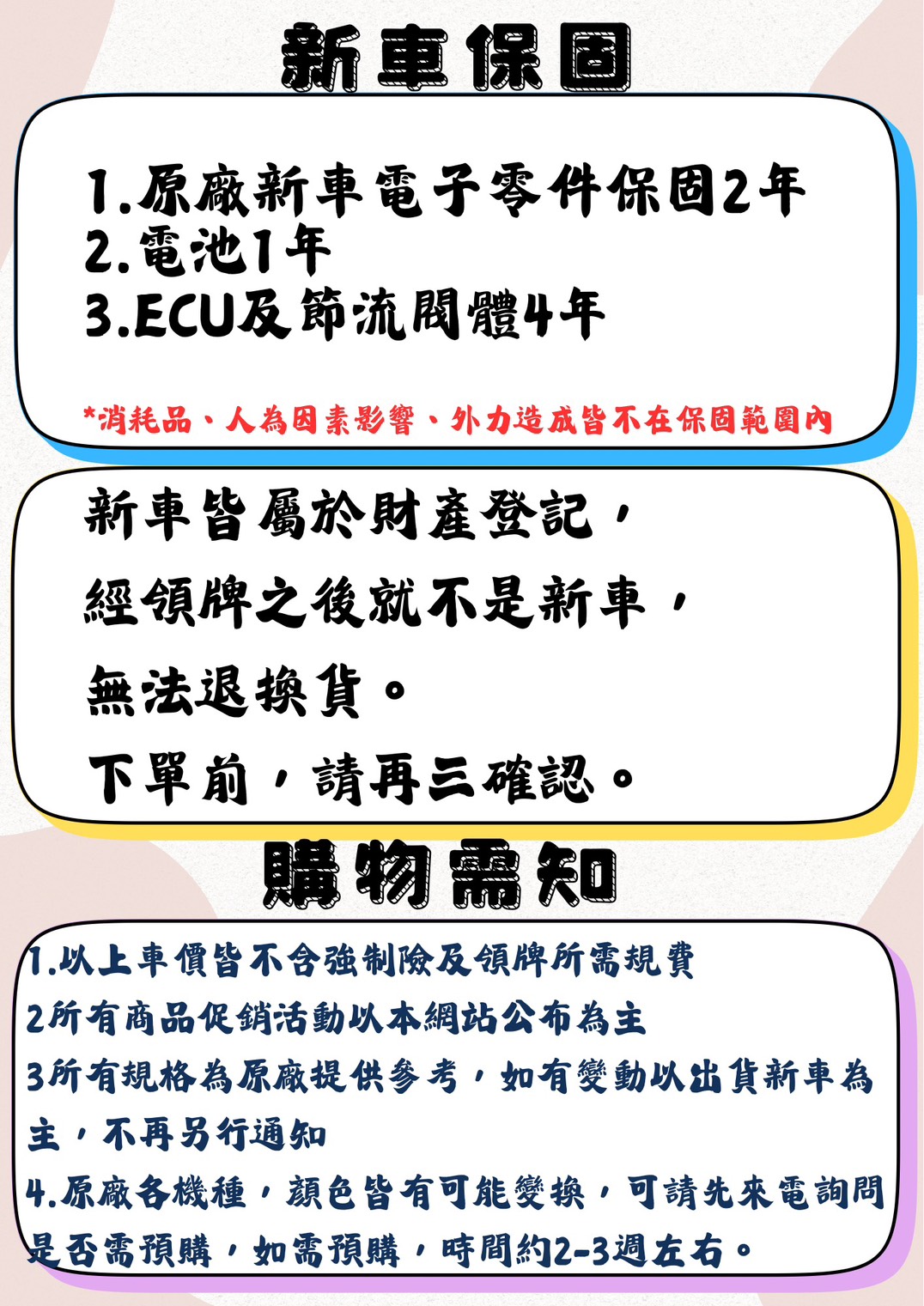 *售價不含領牌規費及強制險費用*新車屬於個財產登記,經領牌後不可退換貨!!