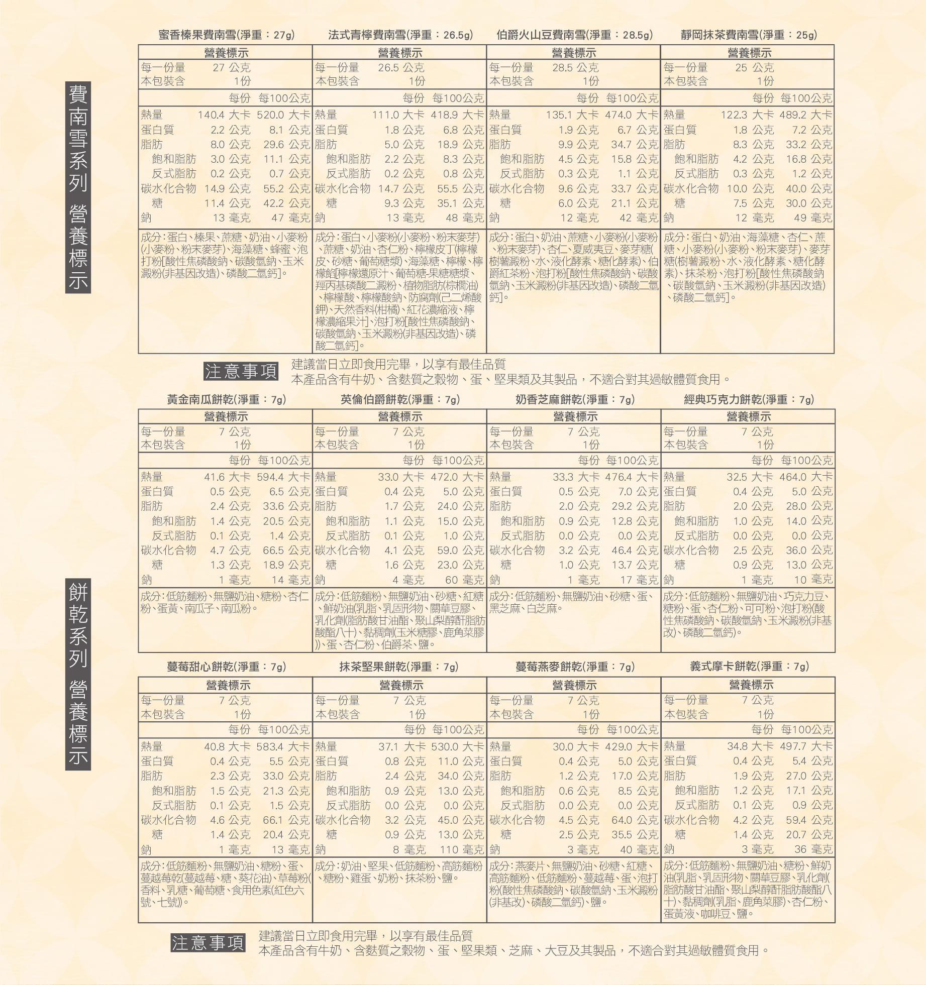 金磚甜點餅乾|4片費南雪&10片手工餅乾費南雪:伯爵火山豆/靜岡抹茶/法式青檸/蜜香榛果餅乾:芝麻/蔓莓/伯爵/南瓜/巧克力📍保存方式:千層酥:未拆封常溫保存21天,拆封後盡速食用完畢