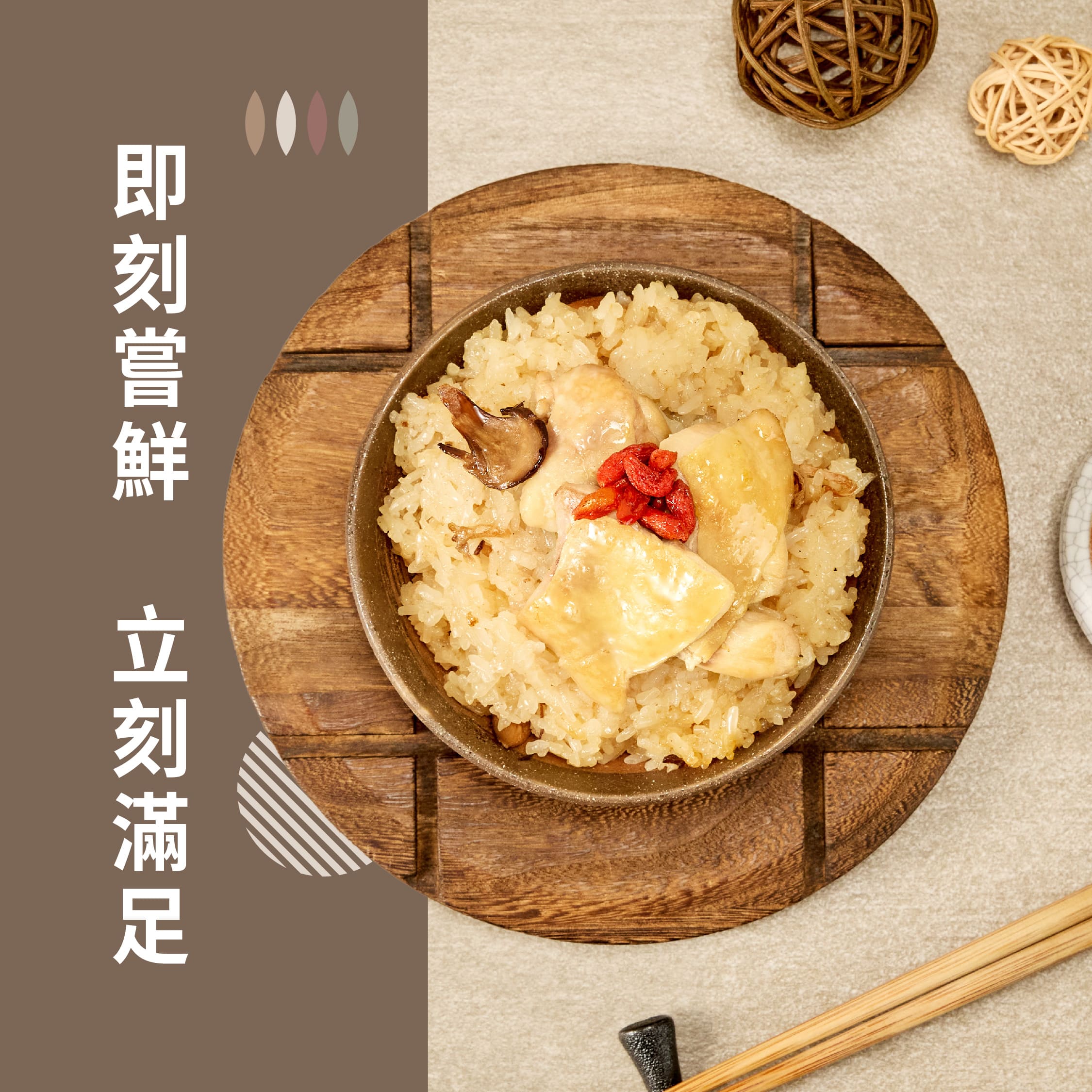 使用臺灣在地長糯米,粒粒香Q有嚼勁加入嚴選臺灣在地仿土雞與老薑拌炒香氣四溢,肉質暖嫩不乾柴,每一口都是滿滿麻油香