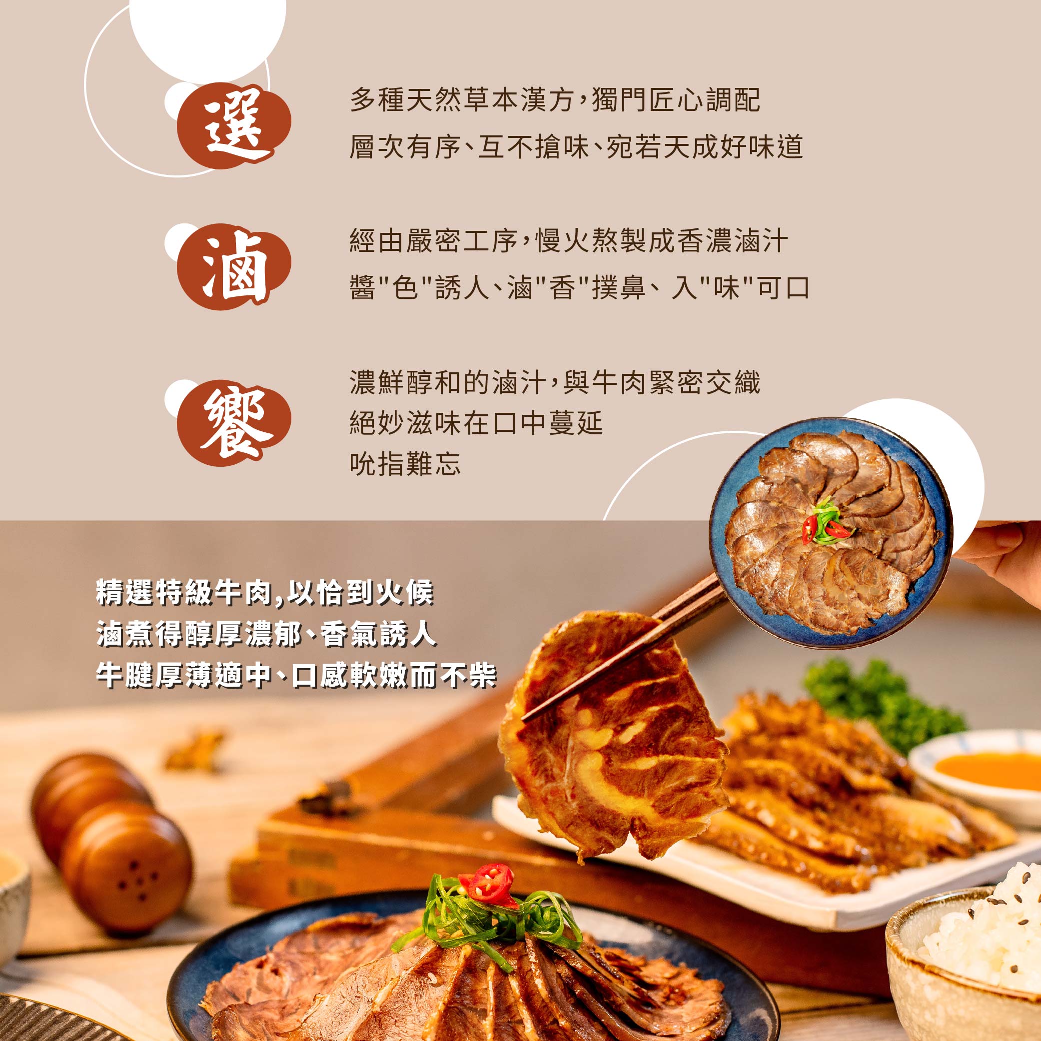 躍進舌尖饗宴,滷惑你的味蕾精選特級牛肉, 多種天然草本漢方,經由嚴密工序,慢火熬成香濃滷汁濃鮮醇和的滷汁與牛肉緊密交織醬色誘人、滷香撲鼻、入味可口牛腱厚薄適中,軟嫩而不柴牛筋軟而不爛,膠質滿滿牛肚蜂巢飽含牛湯精華,嚼感十足搭配主廚特製辣油,絕妙滋味在口中蔓延,令人吮指難忘