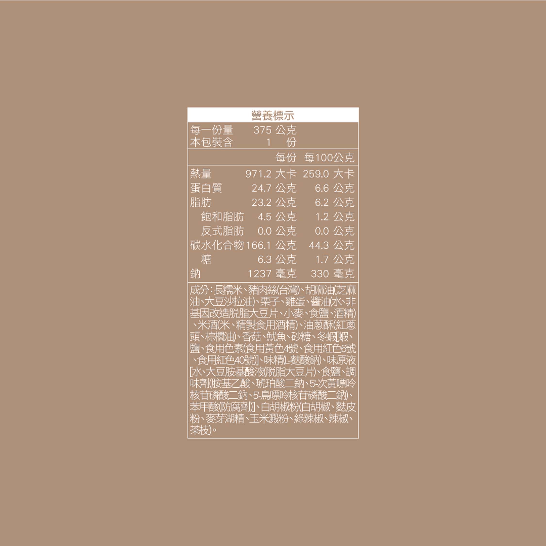 一口嚼進山珍海味,唇齒留香的經典美味精選臺灣在地長糯米混以麻油厚工蒸炊,粒粒香Q不黏牙、米香滿溢以臺灣本產香菇、肉絲、魷魚、金鉤蝦、蛋酥以及渾圓飽滿的栗子拌炒濃濃香味撲鼻而來,讓人一口接一口吃不停的經典美味