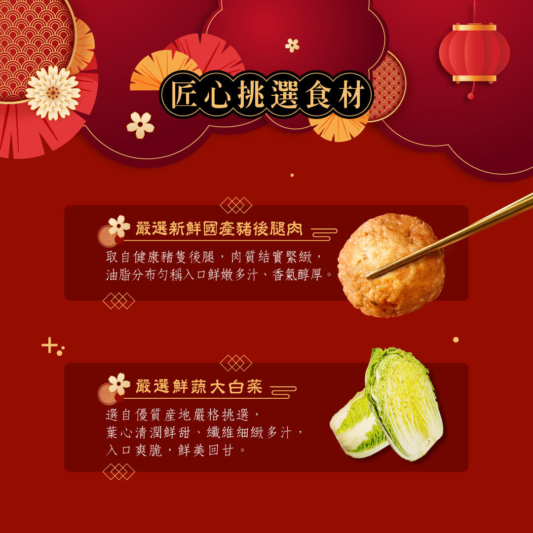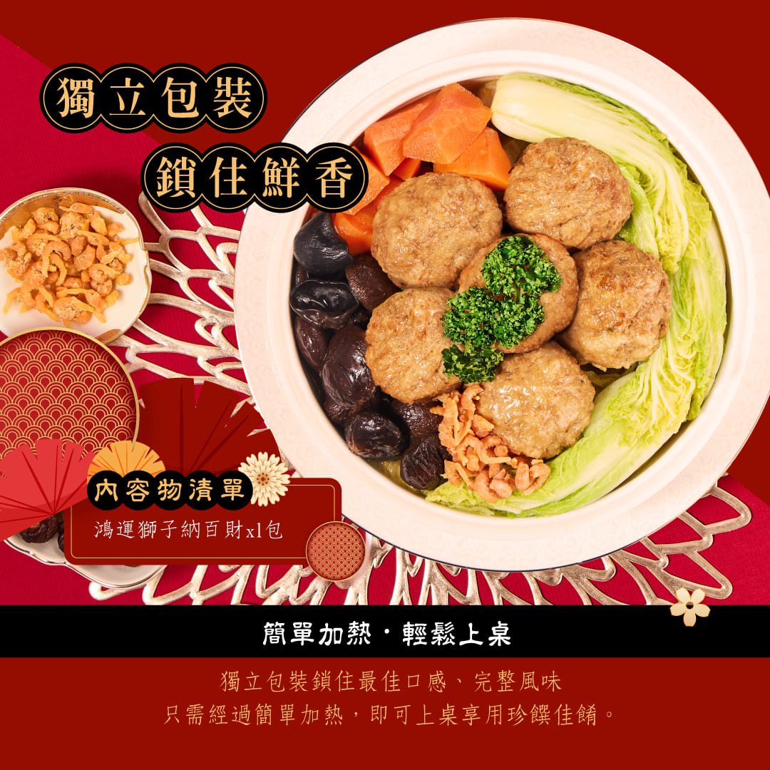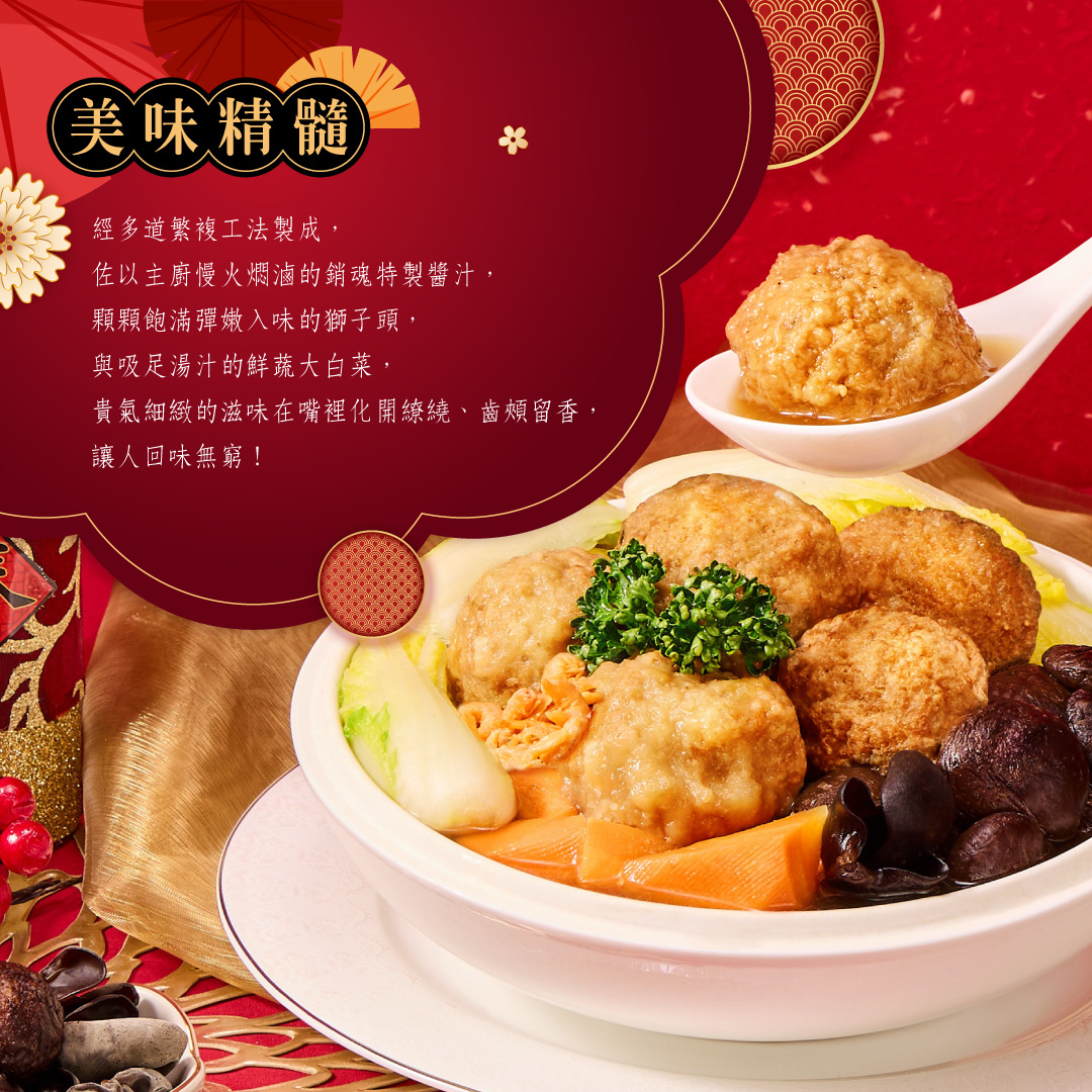 鴻運獅子納百財 — 象徵鴻運當頭、財源廣進,團圓必備佳餚🧧嚴選國產豬後腿肉,經師傅手工拍打成型,以特製滷汁與蔬果一起慢火熬煮,讓湯底多一份自然鮮甜,獅子頭吸飽湯汁,一口咬下湯汁在嘴裡噴開,肉質紮實彈嫩,且不油膩,最適合與家人共享這份滿溢的幸福滋味。➺ 份量十足|飽滿的獅子頭、大白菜、香菇、木耳、胡蘿蔔➺ 鮮甜入味|與蔬果熬煮,獅子頭吸飽湯汁,自然鮮甜➺ 精心講究|獨立包裝,鎖住最佳口感、完美風味