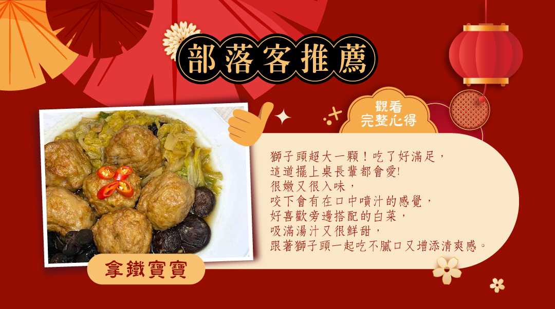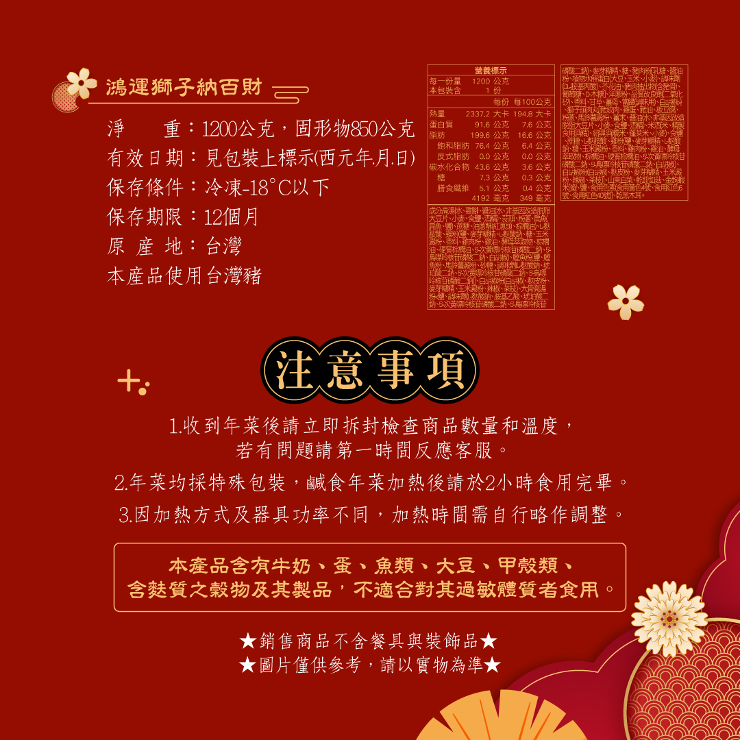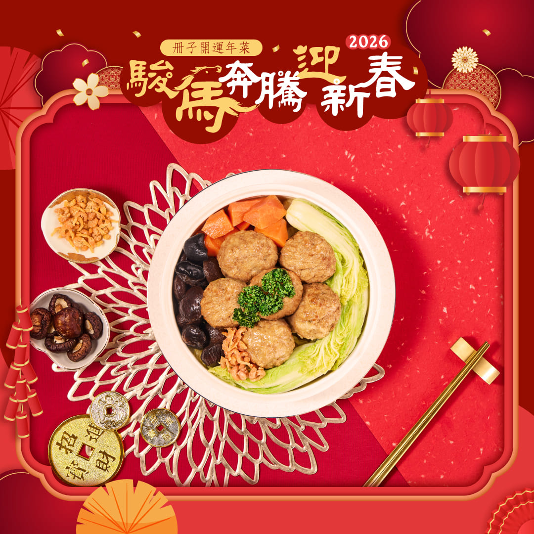 鴻運獅子納百財 — 象徵鴻運當頭、財源廣進,團圓必備佳餚🧧嚴選國產豬後腿肉,經師傅手工拍打成型,以特製滷汁與蔬果一起慢火熬煮,讓湯底多一份自然鮮甜,獅子頭吸飽湯汁,一口咬下湯汁在嘴裡噴開,肉質紮實彈嫩,且不油膩,最適合與家人共享這份滿溢的幸福滋味。➺ 份量十足|飽滿的獅子頭、大白菜、香菇、木耳、胡蘿蔔➺ 鮮甜入味|與蔬果熬煮,獅子頭吸飽湯汁,自然鮮甜➺ 精心講究|獨立包裝,鎖住最佳口感、完美風味