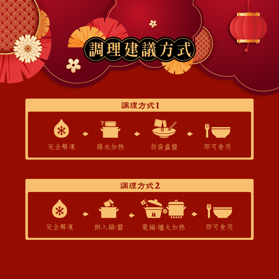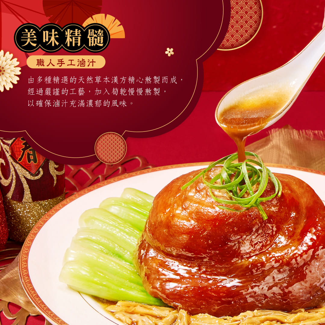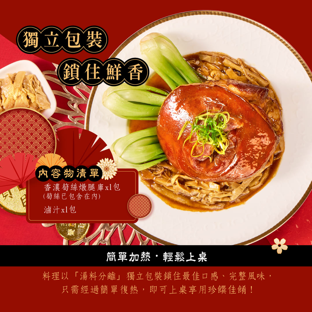 平安富貴金元蹄 — 吃腿庫補財庫,寓意來年財源廣進,滿滿好運與富貴隨之而來。為團圓夜添一份濃厚的年味與財富的祝福🧧滷汁以天然草本漢方熬製而成,再將食材慢慢熬煮,保留筍絲的鮮脆、蹄膀的Q彈,滷汁完美滲入內裡,充分入味,肉質軟嫩多汁卻不顯油膩,一入口便化開的美味,讓人忍不住大快朵頤。➺ 嚴選食材|國產新鮮豬後腿肉、傳統手法精緻筍絲➺ 手工滷汁|由多種天然草本漢方熬製,風味濃郁細膩➺ 精心講究|以湯料分離的獨立包裝,鎖住最佳口感、完美風味