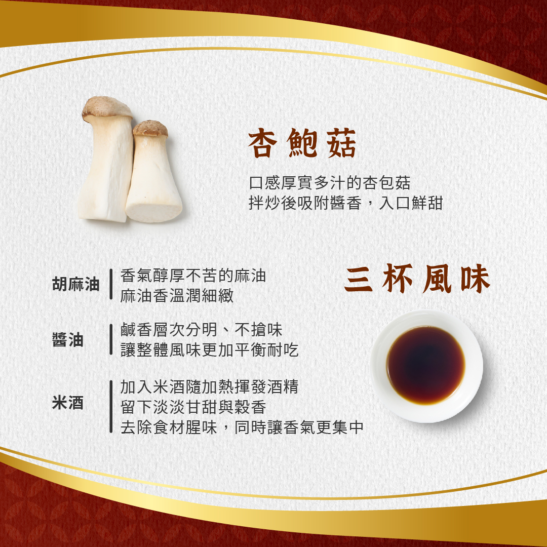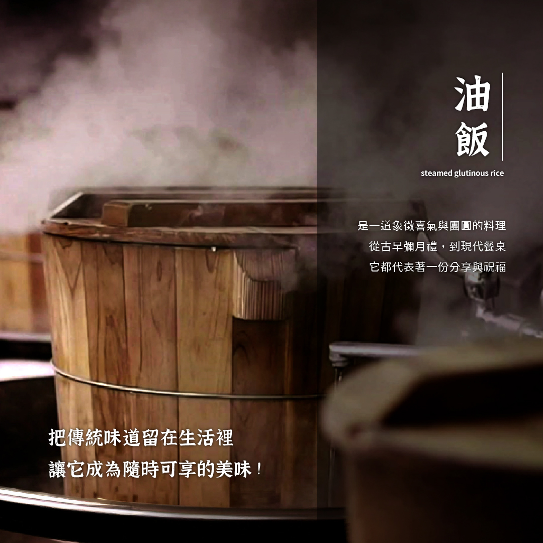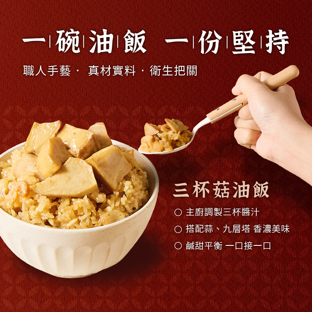 \ 一碗油飯,一份堅持 /嚴選在地長糯米,以傳統古法蒸炊,木桶中縷縷蒸煙升起,米香瀰漫,香氣裡藏著的是師傅的堅持與用心 !主廚特製三杯醬汁拌炒,杏鮑菇與蒜頭吸附醬汁精華,厚實多汁的杏鮑菇與迷人的蒜香,再一起拌入Q彈的糯米中,撒上羅勒葉提香,層層堆疊濃郁又耐吃的三杯風味,帶出人人喜愛的台式經典✨➺ 在地食材|杏鮑菇、薑、蒜頭、金鉤蝦,真材實料,每口滿足➺ 油飯亮點|主廚特製三杯醬,醬香濃厚,香氣綻放➺ 塔香風味|油飯中拌入羅勒葉提味,香氣迷人超強新品三杯菇油飯,延續經典不敗的台式風味🔥