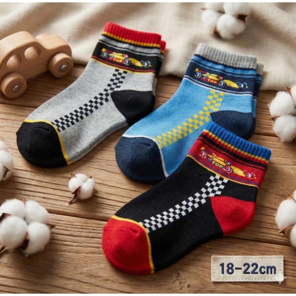 [凱美棉業]12雙組隨機出色 MIT台灣製 純棉賽車童襪 F1賽車三色 18-22cm