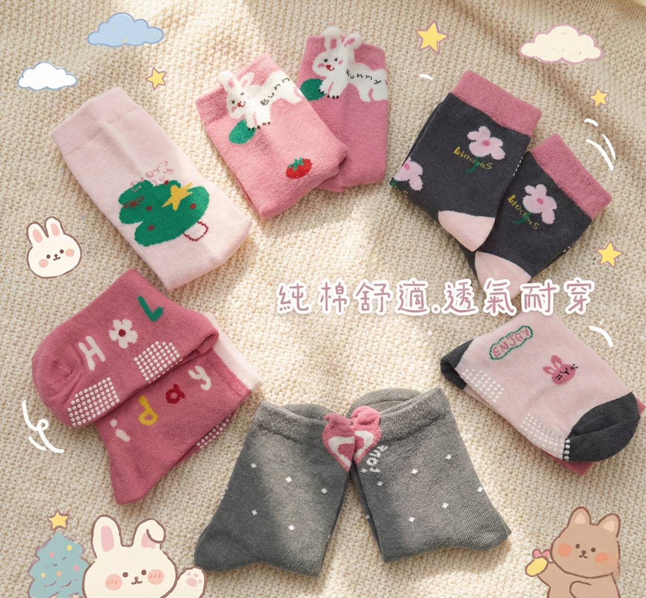 [凱美棉業] 台灣製造 甜美粉色款 卡通童純棉止滑童襪 17-21cm