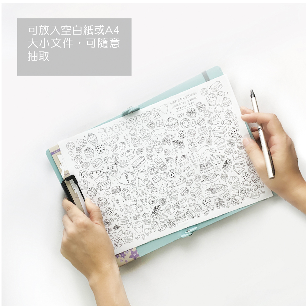 尺寸:32.8x23x1.57 cm 夾持紙張30張◇快速折疊,體積輕巧,方便攜帶,可輕鬆放入隨身包包。 ◇橫放對折可變身A5雙面筆記◇彈性編織筆夾