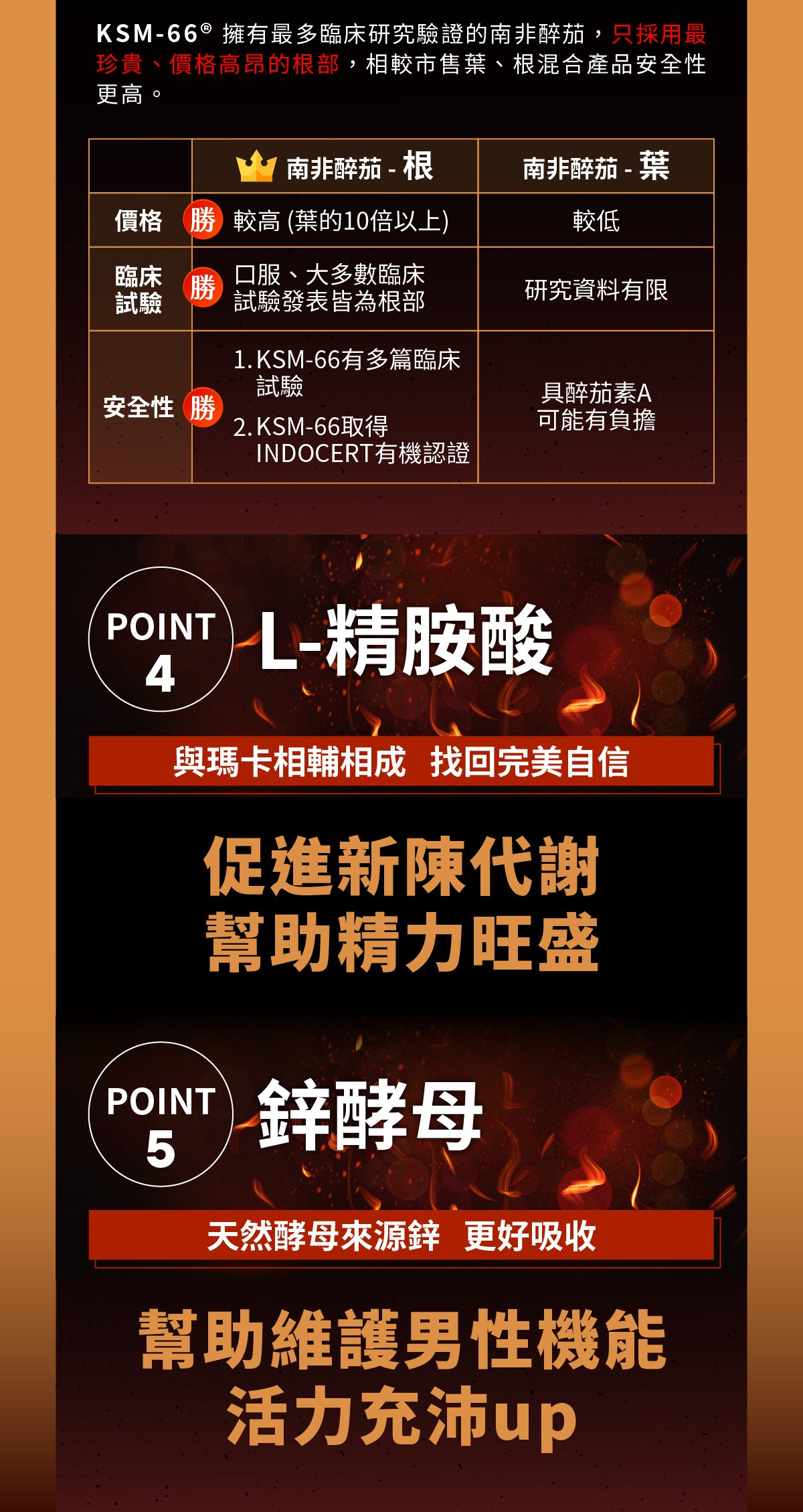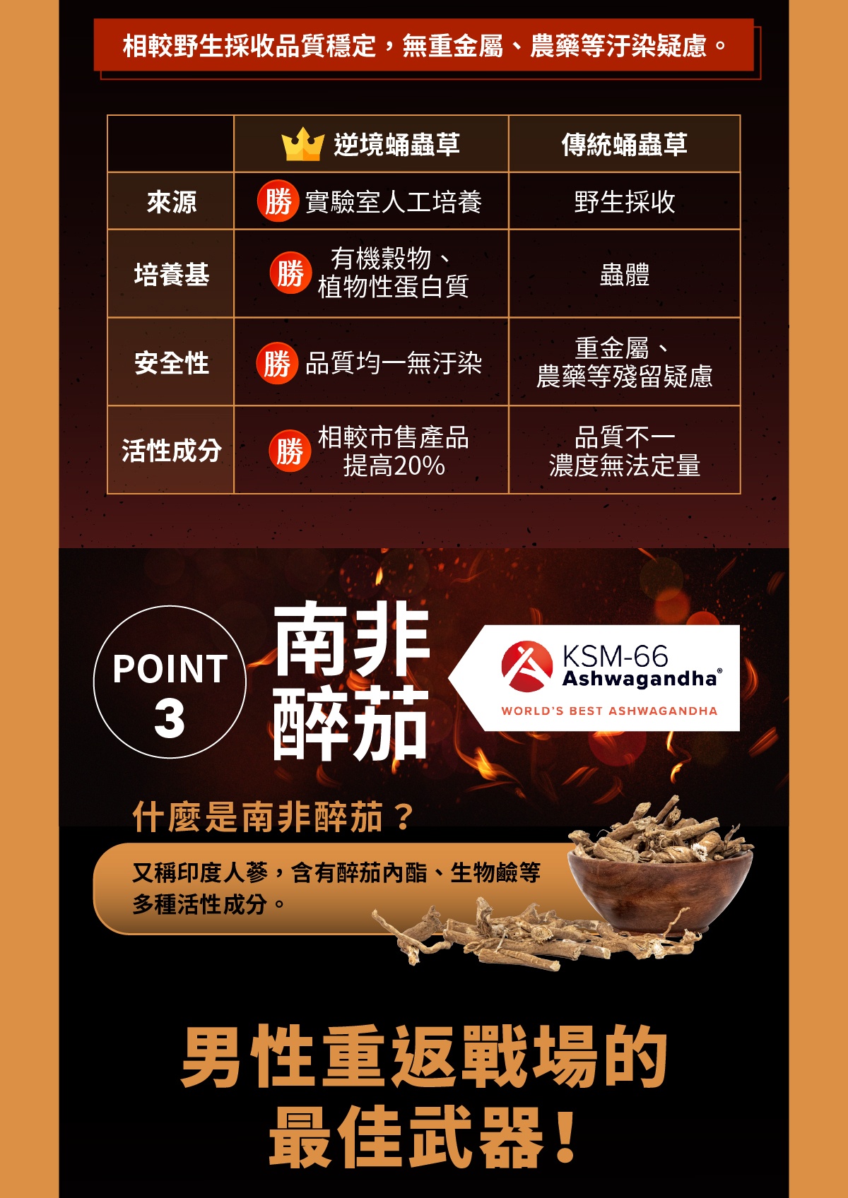 產品成分:馬卡粉、蛹蟲草菌絲體(粉)、微結晶物狀α-纖維素、鋅酵母(非活性酵母、硫酸鋅)、南非醉茄根萃取(南非醉茄根萃取物、牛奶)、米糠濃縮物、生薑萃取物(生薑萃取物、麥芽糊精)、L-精胺酸。 膠囊成分l明膠、甘油、硫酸月桂酯納、純水。
