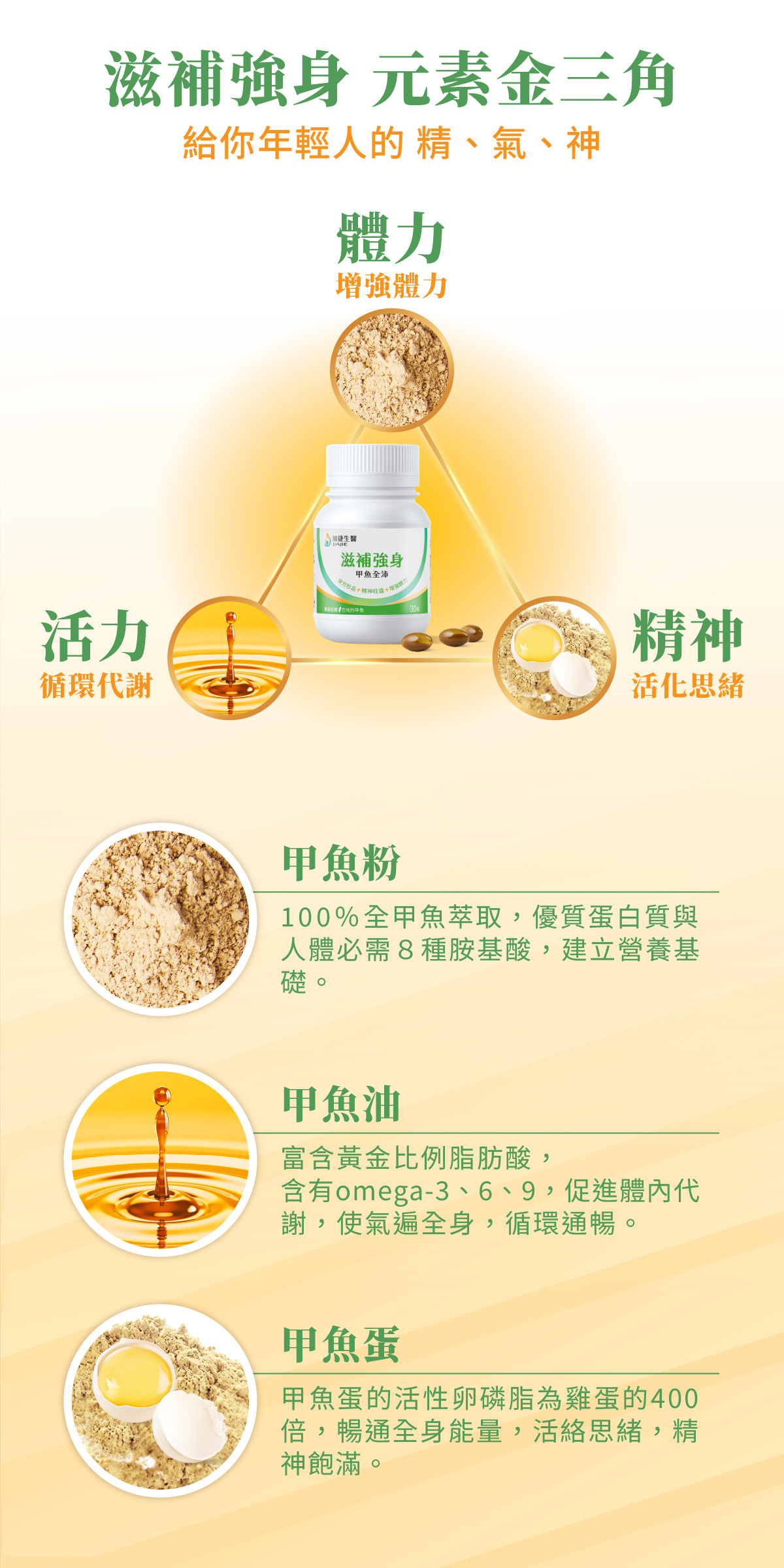 📍補充日常不足,全方位提振〝精、氣、神〞︳台灣甲魚營養保健品領導品牌︳採用台灣在地培養中華甲魚︳全方位(甲魚+甲魚油+甲魚蛋)配方︳甲魚粉含優質蛋白質與人體必需8種胺基酸︳甲魚油含有黃金比例脂肪酸Omega-3 6 9︳甲魚蛋的活性卵磷脂為雞蛋的400倍︳專利熱濃縮技術,保留全甲魚45種以上自然營養︳快速取代鱸魚精、滴雞精︳SNQ國家品質標章︳穀研所雙潔淨標章︳歐盟A.A.三星驗證-關鍵成分:甲魚油、甲魚粉、甲魚蛋粉規格:30粒/瓶,每粒0.8公克劑型:膠囊葷素別:葷產地:台灣