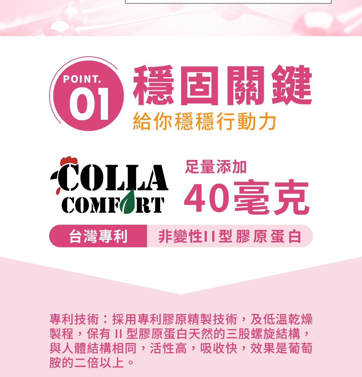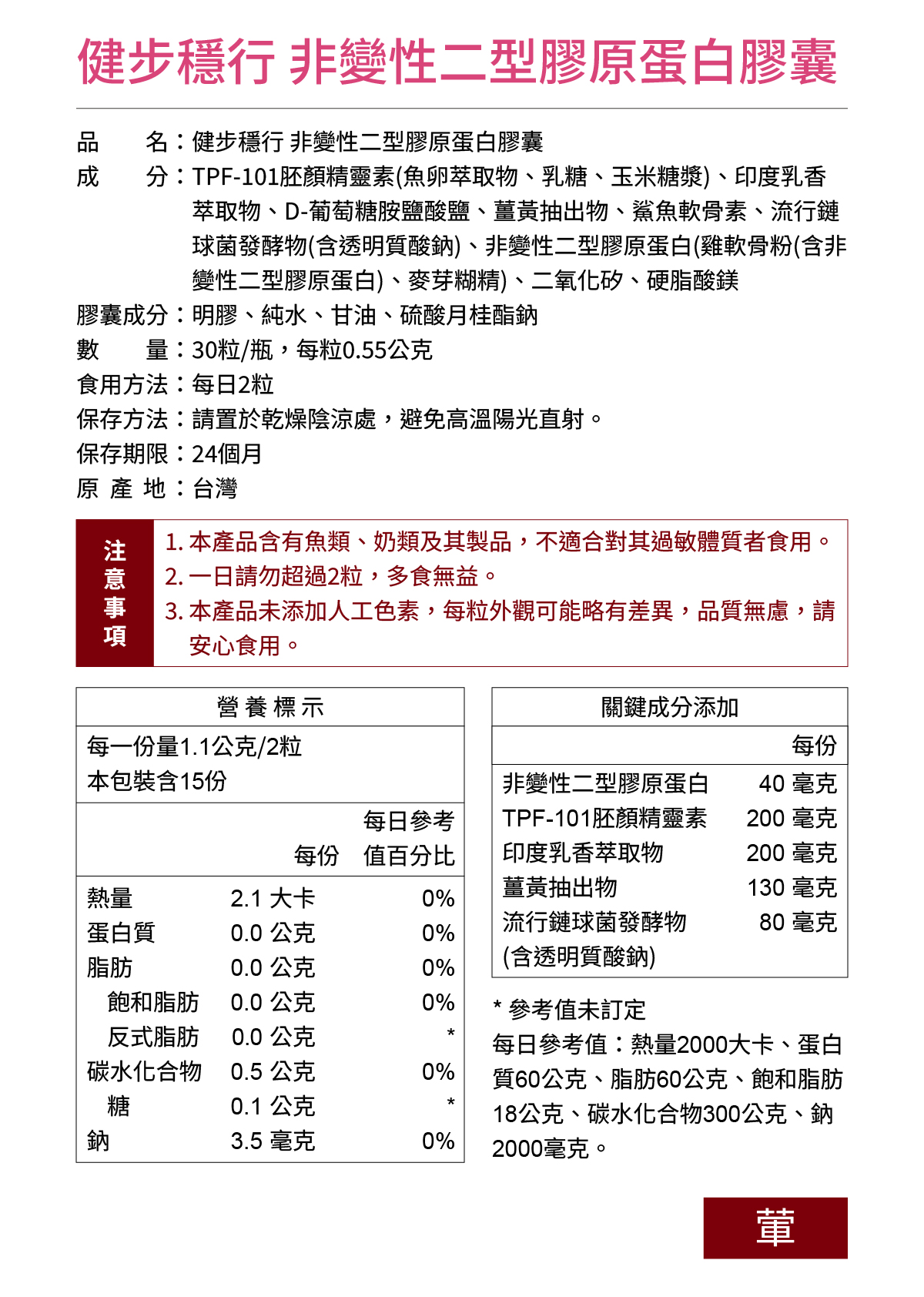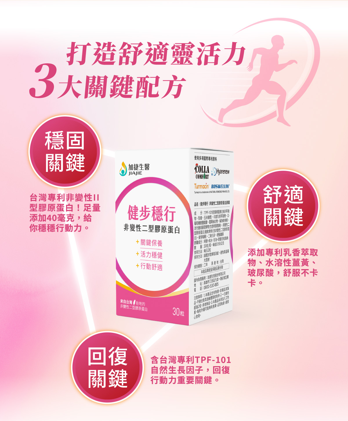 【三大關鍵專利配方 打造舒適靈活力】◆穩固關鍵:專利非變性二型膠原蛋白,足量添加40毫克,給你穩穩行動力◆舒適關鍵:專利乳香、水溶性薑黃、玻尿酸 舒適不卡卡◆回復關鍵:台灣在地專利自然生長因子,回復行動力重要關鍵◆加捷生醫用天然在地、安全有感、專業配方 幫你養健康關鍵成分:非變性二型膠原蛋白、TPF-101胚顏精靈素、印度乳香萃取物、薑黃抽出物、流行鏈球菌發酵物(含透明質酸鈉)規格:30粒/瓶,每粒0.55公克劑型:硬膠囊葷素別:葷產地:台灣