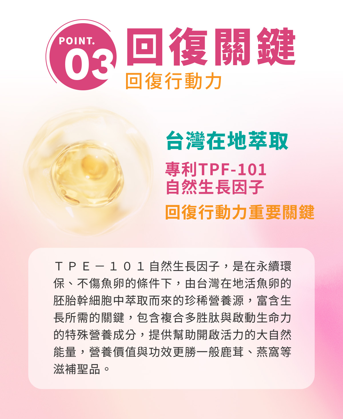 內容物成分: TPF-101胚顏精靈素(魚卵萃取物、乳糖、玉米糖漿)、印度乳香萃取物、 D-葡萄糖胺鹽酸鹽、薑黃抽出物、鯊魚軟骨素、流行鏈球菌發酵物(含透明質酸鈉)、非變性二型膠原蛋白(雞軟骨粉(含非變性二型膠原蛋白)、麥芽糊精)、二氧化矽、硬脂酸鎂 膠囊成分:明膠、純水、甘油、硫酸月桂酯鈉